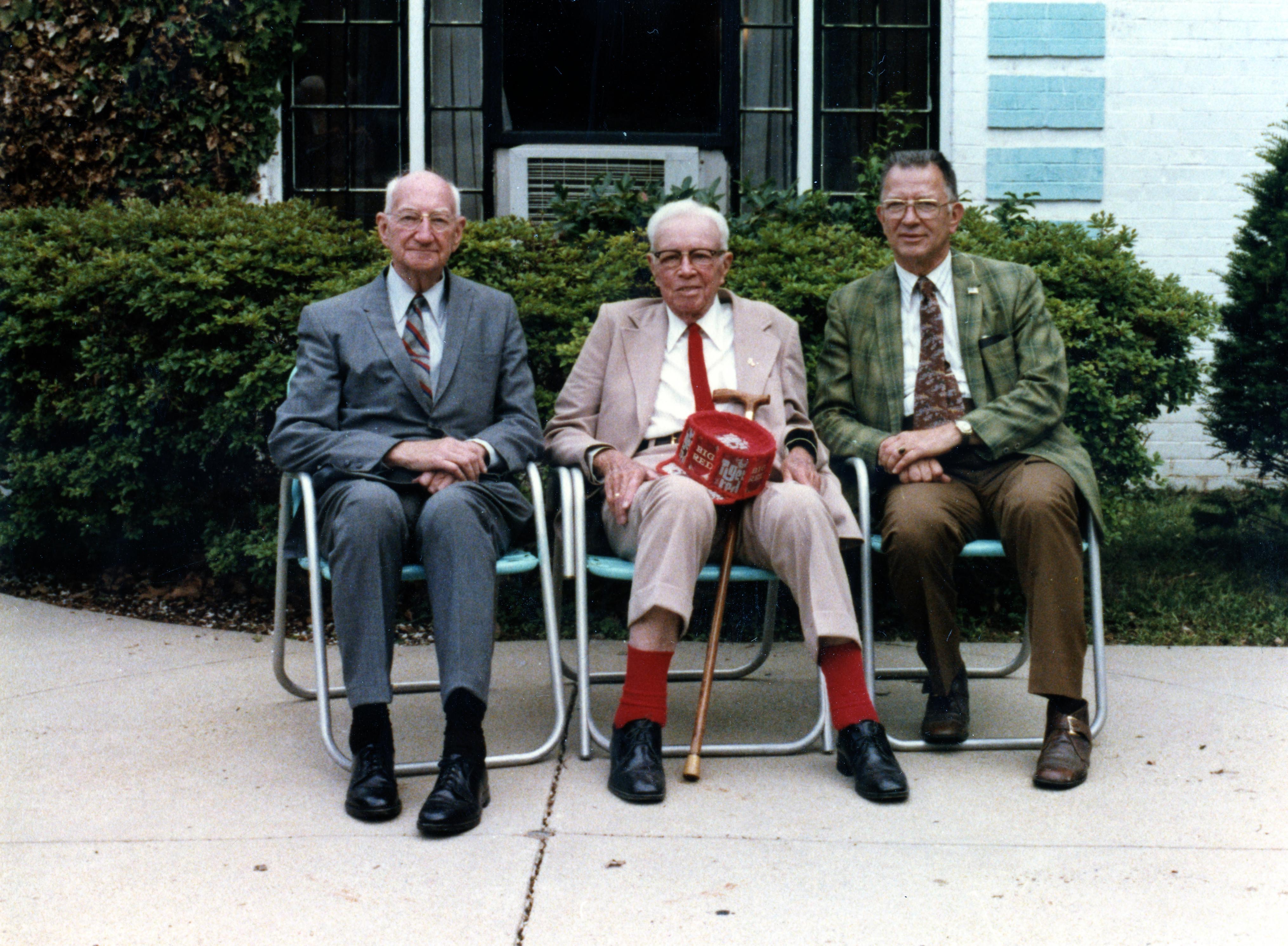 H.A. Woods (center) sitting in a lawn chair outside a house, with 2 unidentified men. He is holding a Big Red/Tiger Red hat. NOTE: this location is the same as MSS 160-012. Henry Alexander Woods was born May 17, 1886 outside of Louisville, KY. He worked his way through pharmacy school at the University of Kentucky, graduating at age 18 in 1904. He became an Evansville businessman in 1916 with the purchase of the first of 13 drug stores. He was one of the founders of the Downtown Kiwanis club and was known in the community for his activities and for always wearing a red tie. He died January 12, 1978.