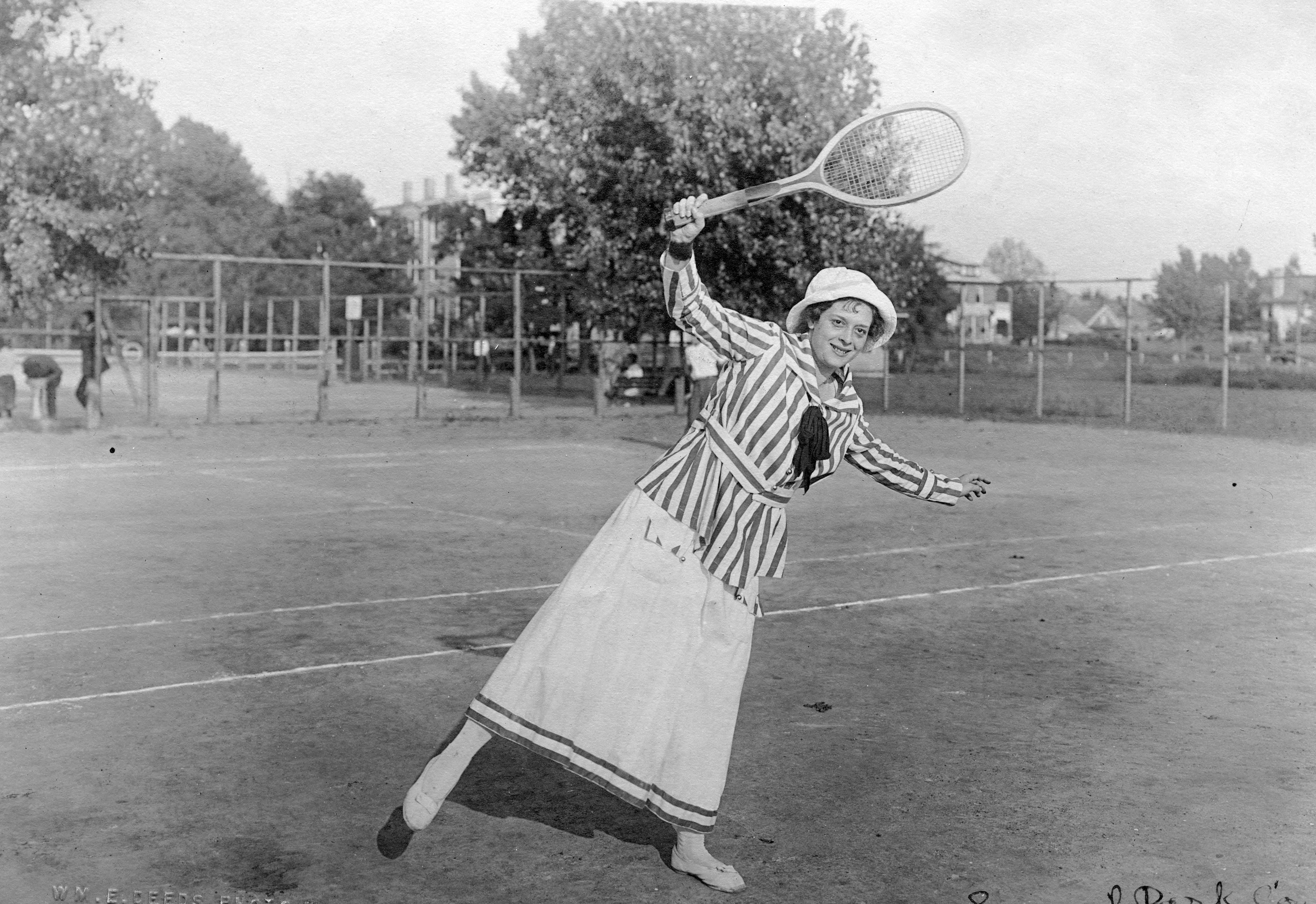 Florita Eichel at the first girls tennis tournament at Sunset Park. The September 10, 1916 Evansville Courier had a long article about this tournament, with multiple photographs, one of which was this one of Florita Eichel serving, credited to Deeds. William Deeds was a photographer hired by the Evansville Courier in 1906. According to this article, Eichel was "one of the chief instigators of this first city tournament." She was eliminated from the singles tourney on September 13, but went on to play doubles, also. She was the originator of this photographic collection and a sister of the owner of the White Swan Laundry, one of Evansville's first steam laundries. In her own right she was an accomplished artist, according to her obituary after her May 14, 1983 death at the age of 90. She was employed by the Evansville Museum for over 20 years, which has some of her work in its permanent collection. "Evansville's Riverfront once was the hub of the city's commercial activity, but residents soon recognized its recreational possibilities. In 1850, a newspaper suggested that the "delightful tract" of land along the river be converted into a public park, and by the early 20th century, the vision had become a reality. Offering a magnificent view of the setting sun, the newly landscaped park was aptly named Sunset Park." (http://historicevansville.com/site.php?id=sunsetpark).