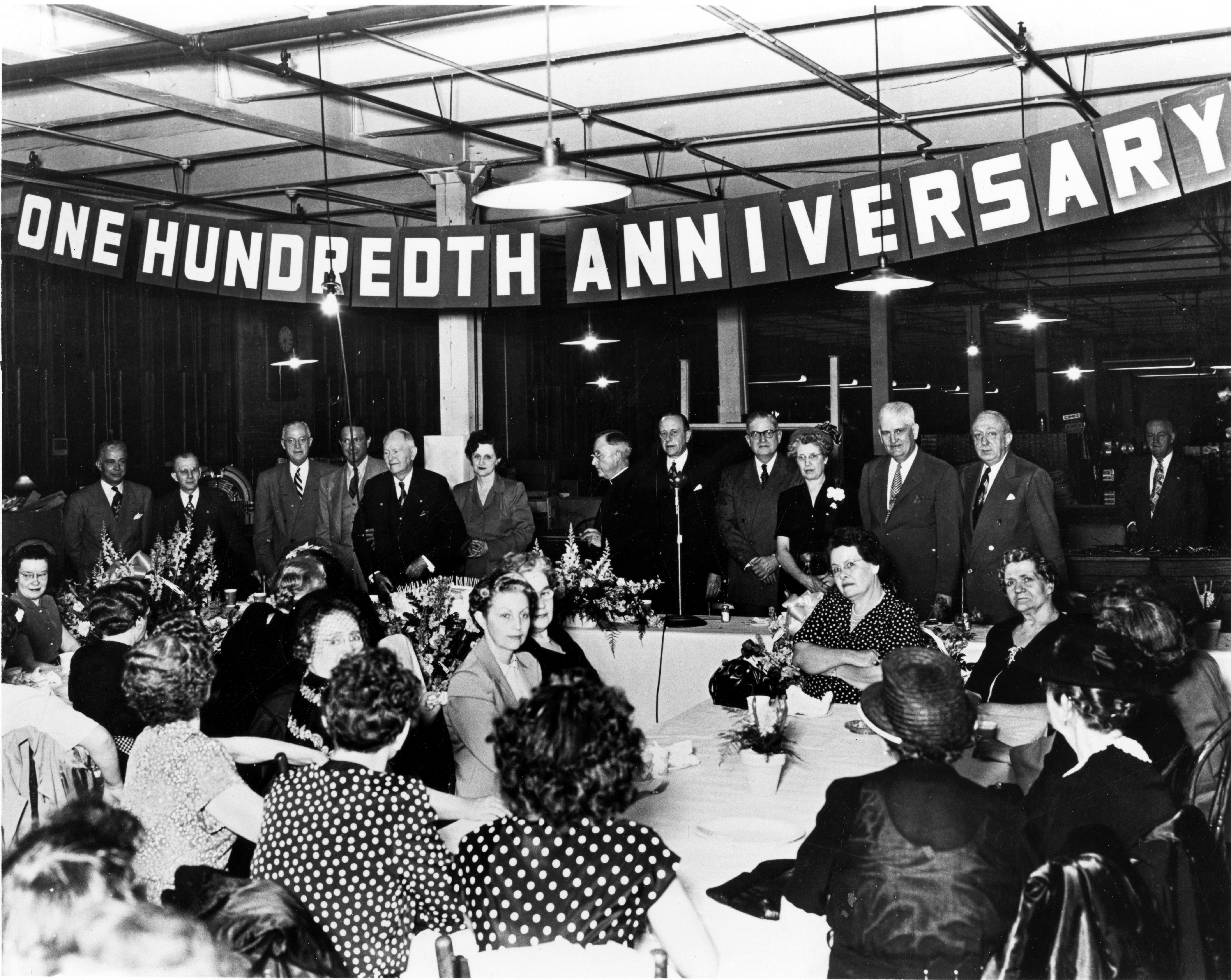 Party celebrating the 100th anniversary of the Fendrich Cigar Co. at 111-115 Main St. This location burned in 1910 and the company moved to its final location on Oakley St. in 1912, closing its doors in 1969. In 1833 the Fendrich family immigrated to Baltimore from the Margraviate of Baden in the Holy Roman Empire (today's Germany). The Germanic principalities from whence they came had a history of cigar making. In the 1840s Fendrich brothers Joseph, Karl (Charles), Franz (Francis) and Herrmann started the tobacco and cigar business. In 1855 the company headquarters moved to 21 Main St. in Evansville. New factory complex opened in 1912, and Fendrich Cigar Company had around 1,500 employees at that time.
