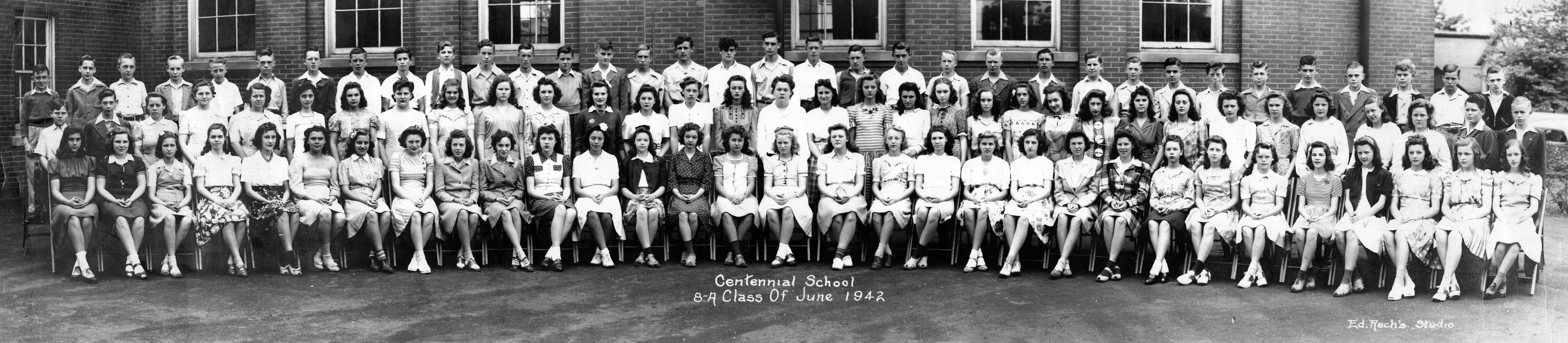 Row 1 (L-R): Sue Shelton, Margie Wallace, Jo Ann Walker, Jimmie Sue Hard, Erma Ashley, Betty Granderson, Pearl Ervin, Joyce Brown, Mary Ellen Hottendorf, Ruby Ann Hones, Doris Hand, Beverly Henry, Mary Lou Hicks, Delores Kerchief, Dorothy Hoover, Eileen Egan, Ramona Coleman, Jerine Burton, Gertrude Bayes, Helen Daub, Peggy Erwin, Mary Helen Carter, Doris Anson, Myrtle Jo Hedges, Bessie Keown, Gloria Georgette, Betty Kanowsky, Jean Corns, Verna Mae Braun, Marion Baumgart; Row 2 (L-R): Teddy Fields, Herbie (Herbert) Roth, Alice McFarland, Mary Lou Townsend, Jeannette Frank, Dolores Lehman, Kathryn Gowdy, Beverly Gerard, Betty Graham, Archilee Hobgood, Charlotte Rupp, Mildred Millard, Cora Mae Sims, Dorothy Wessel, Patricia Hedges, Lois McAtee, Maxine Miller, Mildred Caudill, Florence Ford, Marjorie McWilliams, Dorothy DeWeese, Mary Ellen Cox, Beth Seiler, Dories Simmons, Alma Riley, Joyce Fisher, Esther Newman, Betty Russell, Freida Blandford, Lorraine Robinson, Hazel Harmon, James Shrode, Ronald Hilgeman; Row 3 (L-R): Larry Morris, Gordon Klahn, Charles Pease, Ernest Hancock, Richard Fuchs, J.C. Egli, Leonard Gentry, Bob (Robert) Southwood, Bill Moss, Ellis Hines, Gilford Pinkston, Gene Carlton, Bill Haas, Paul Peters, Wilfred Helford, Donald Gray, Bill Rommel, Charles Brust, Norman Brumley, Earl Bradley, Al Brandau, Jim Wolfe, John Tucker, Jack Boheleber, Bruce Waterman, Lawrence Montgomery, Louis Abney, Ray Seibert, Donald Koring, Allen Lashley, Robert Kraemer, Billy Pigman, and Howard Egli. Centennial High School 8-A Class of 1942. In the latter part of the 19th century, Evansville as it stands today did not exist. In addition to Evansville, there were small, independent pockets, one of these being Independence, which was roughly the area west of Pigeon Creek. This area was annexed into the city in 1870, and one of the benefits was the 1875 construction of a 3 story, 12 room school to serve the needs of a growing west side population. It replaced a smaller school on Wabash Ave., which in turn became the "colored school." The bell tower shown here was removed in 1945 due to poor condition and thereafter displayed within the school. Centennial School was closed in 1965 when a newer school, Helfrich Park, was constructed to serve these students. "When public higher education came to Evansville, the school served as the regional campus for Indiana State University. ISUE (Indiana State University-Evansville), now the University of Southern Indiana [owner of this photographic collection], opened in September 15, 1965. By September of 1969, the university moved out to its present location leaving the building vacant" (http://historicevansville.com/site.php?id=centennial). Centennial School was razed in 1972.