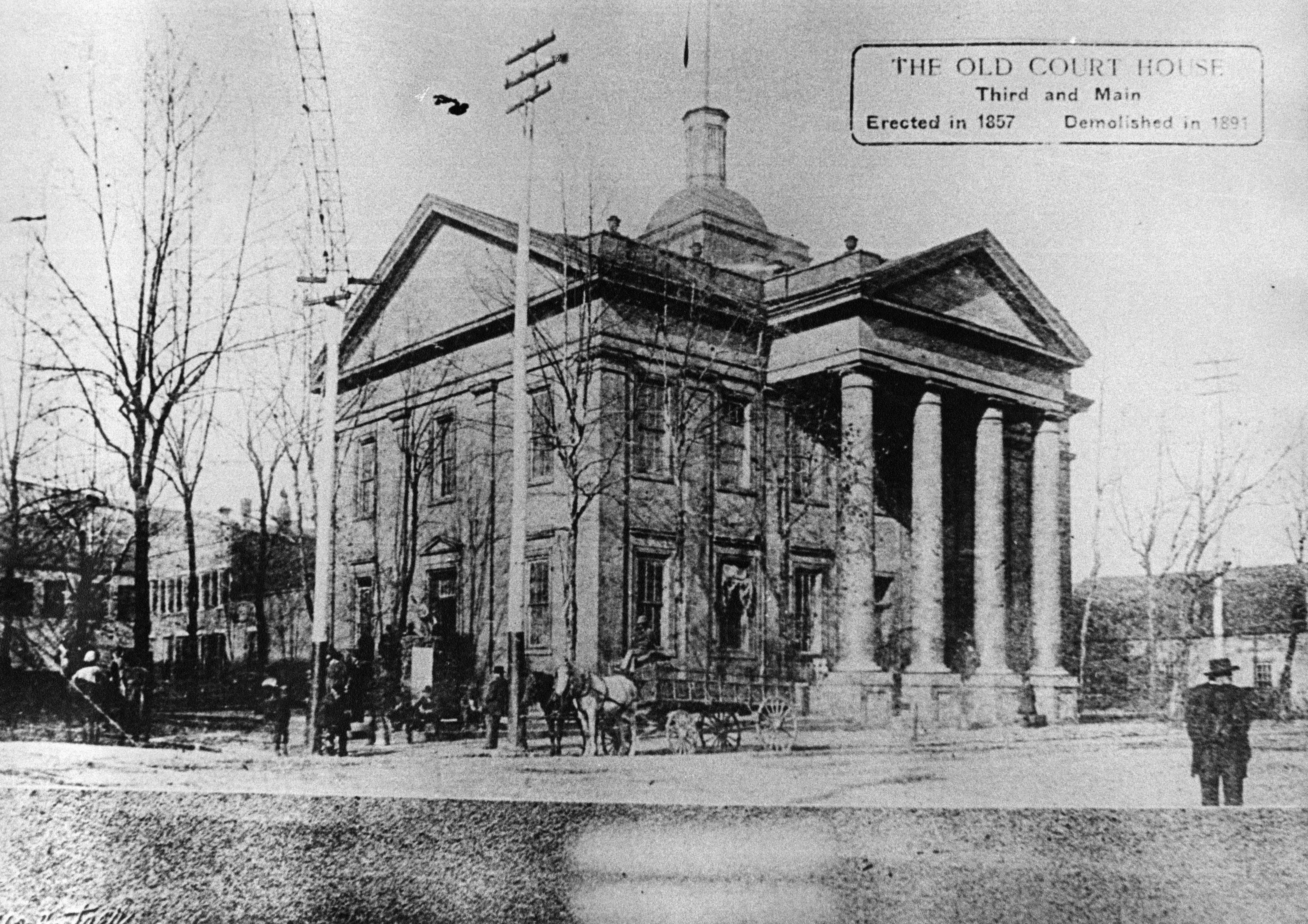 Old courthouse at 3rd St. and Main St. This is the second Vanderburgh County courthouse--built 1852-1855, it replaced a 1820 structure. When nearly completed in 1855, it was destroyed by fire on Christmas Eve, but rebuilt according to the same plans and opened in 1857. In 1891 the courthouse moved to its a location between Vine St., Court St., NW 3rd St., and NW 4th St. This is the location most commonly referred to as the old courthouse; the current seat of county business is in the Civic Center complex at 1 NW Martin Luther King, Jr. Blvd. The building seen in this photograph was razed in 1891, although its foundation was used to build its successor building, the Eichel Block (which was itself razed in 1984).