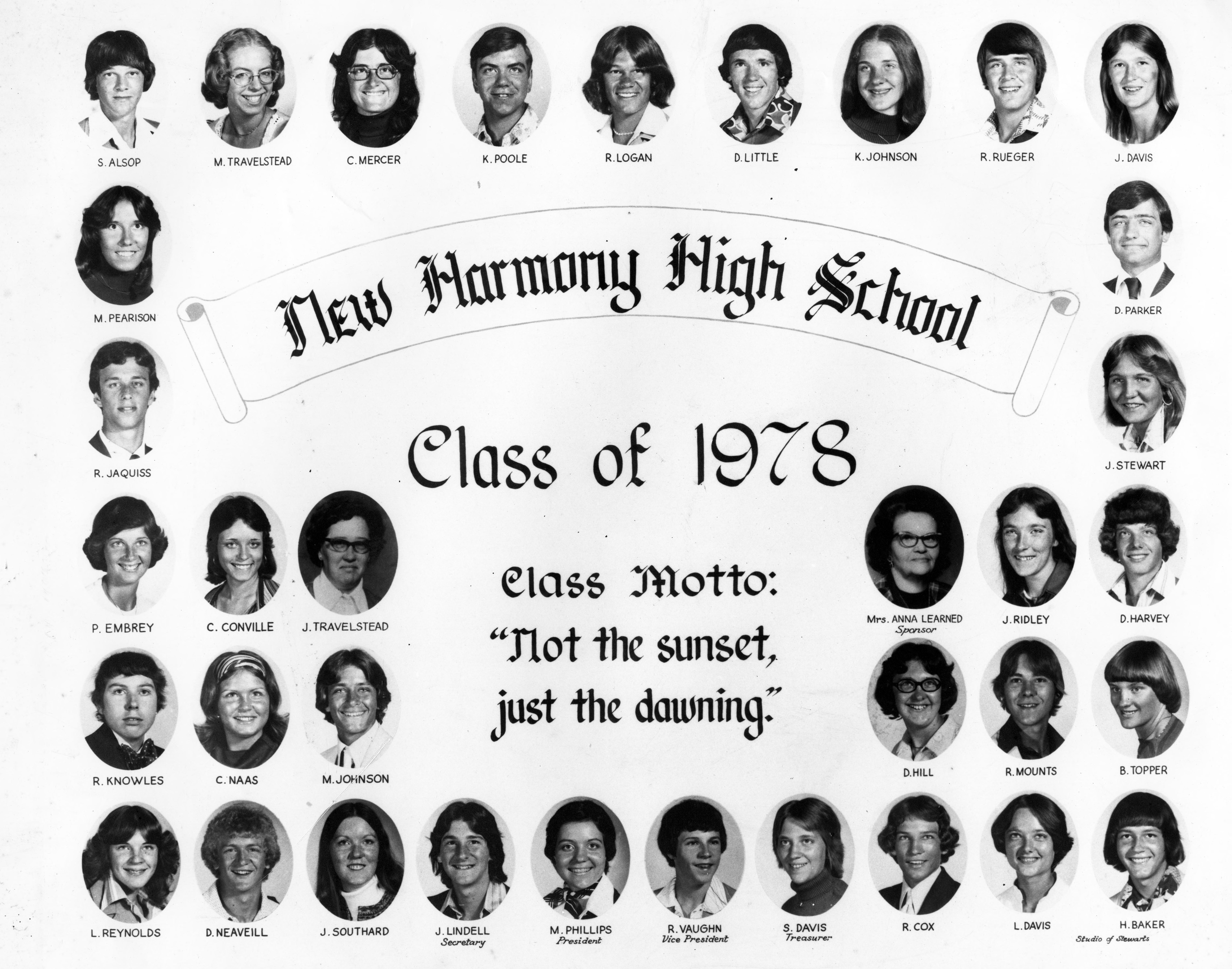 New Harmony High School Class of 1978 class photograph. Students were S. Alsop, M. Travelstead, C. Mercer, K. Poole, R. Logan., D. Little, K. Johnson, R. Rueger, J. Davis, D. Parker J. Stewart, J. Ridley, D. Harvey, D. Hill, R. Mounts, B. Topper, H. Baker, L. Davis, R. Cox, S. Davis (treasurer), R. Vaughan (vice president), M. Phillips (president, J. Lindell (secretary), J. Southard, D. Neaveill, L. Reynolds, R. Knowles, C. Naas, M. Johnson, J. Travelstead, C. Conville, P, Embrey, R. Jaquiss, M. Pearson, Mrs. Anna Learned (sponsor)