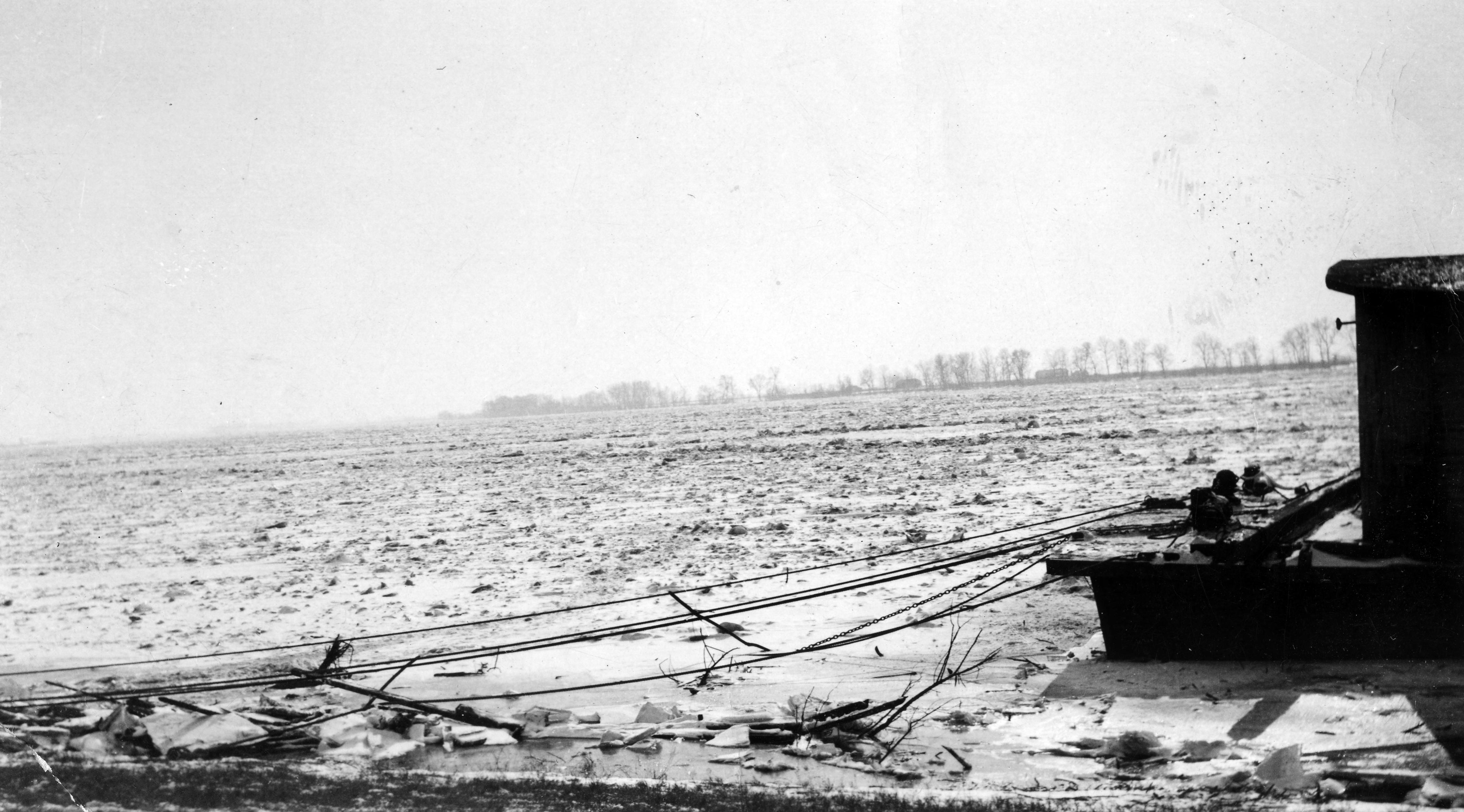 There were large amounts of ice, amounting to an ice gorge, on the Ohio River in February of 1936 (and they reoccurred the next winter, too). The newspapers of the time were full of this, even including locations where you could go to view this phenomenon. These pictures were taken from or near the SIGECO (Southern Indiana Gas and Electric Co.) plant on the river. Here a barge is stopped by the ice.