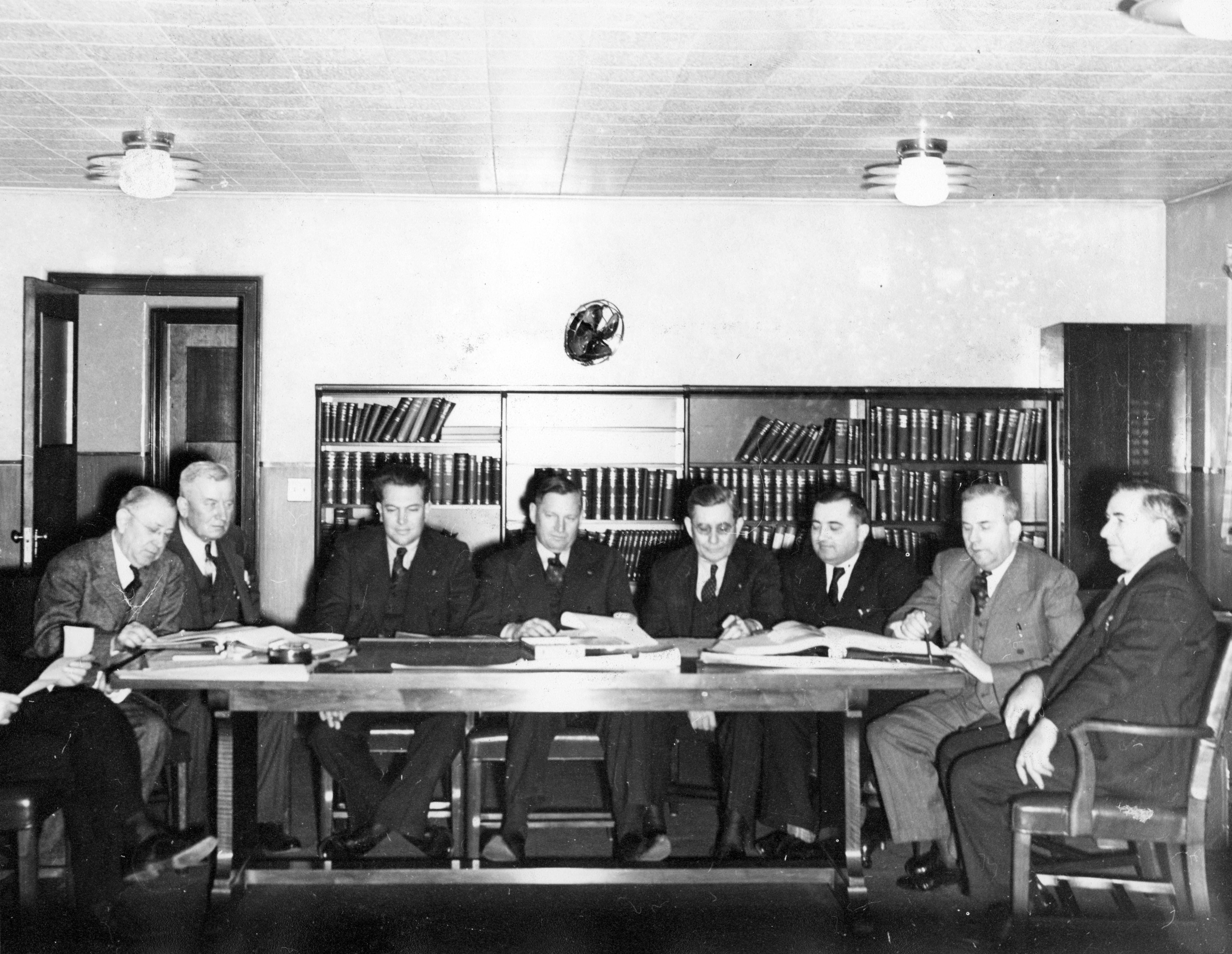 Eight unidentified men seated at a table with ledgers. Winfield Denton is the first man on the left.