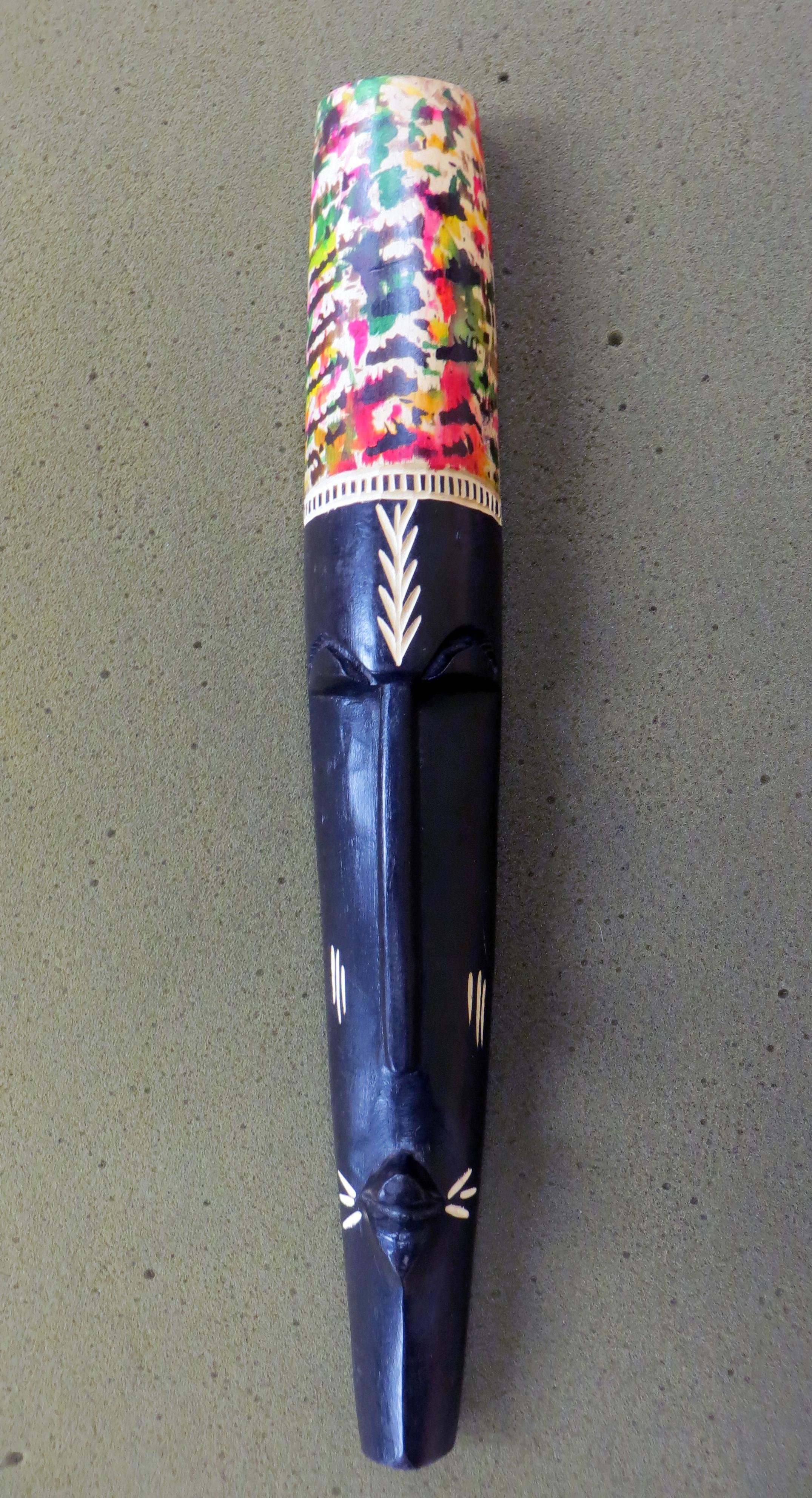 oblong mask that is wood and carved. Broken into two sections that the top half has red, green, black, orange, yellow. With a background of beige and below that section is black. The carvings are located above the eyes and to break up the two sections. also around the mouth and cheeks. 11.5inx1.5in