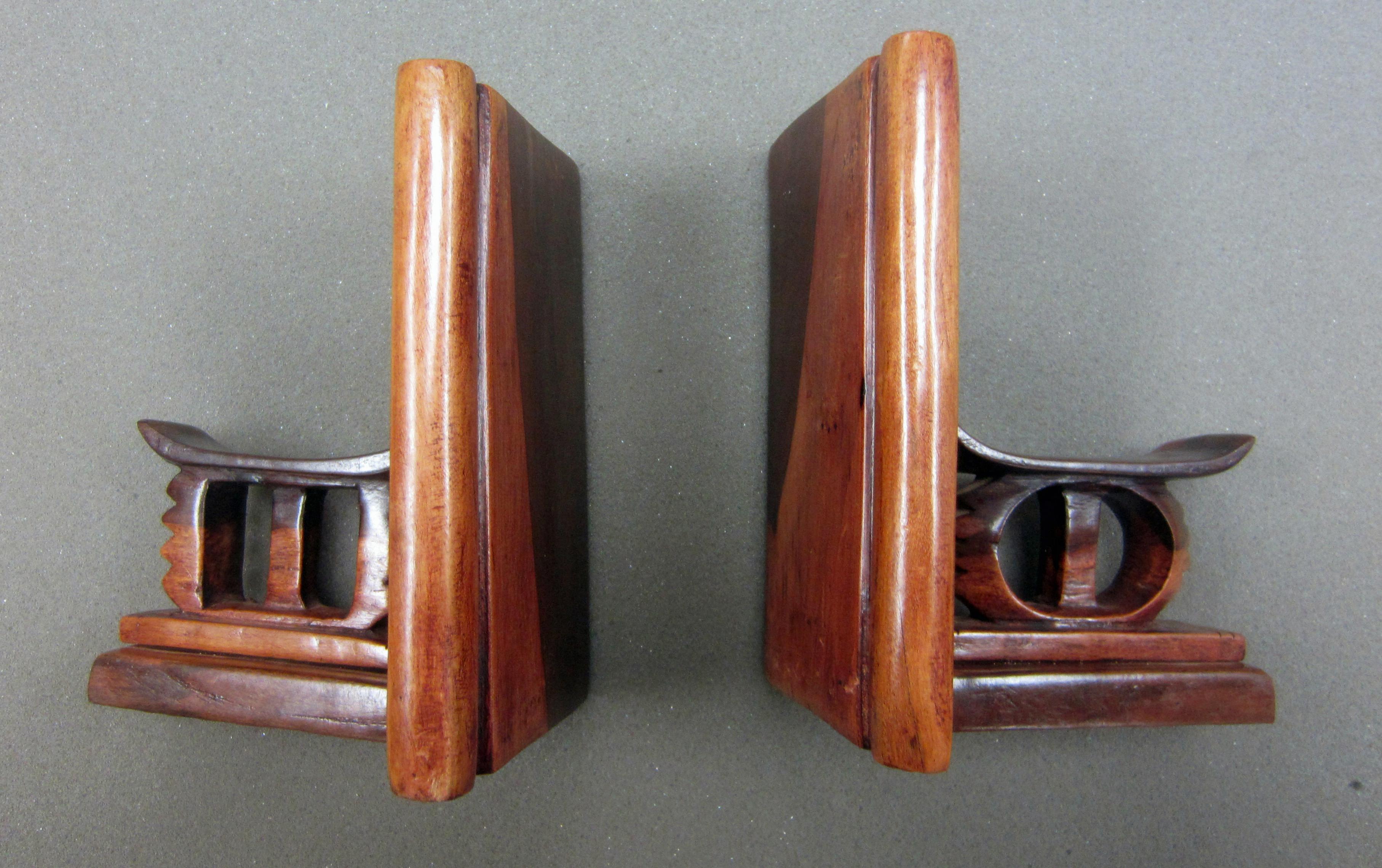 Carved wooden book end with the Gye Nyame symbol on its face. The artifact also has an extended piece from its base. 15mm x 9mm x 11mm