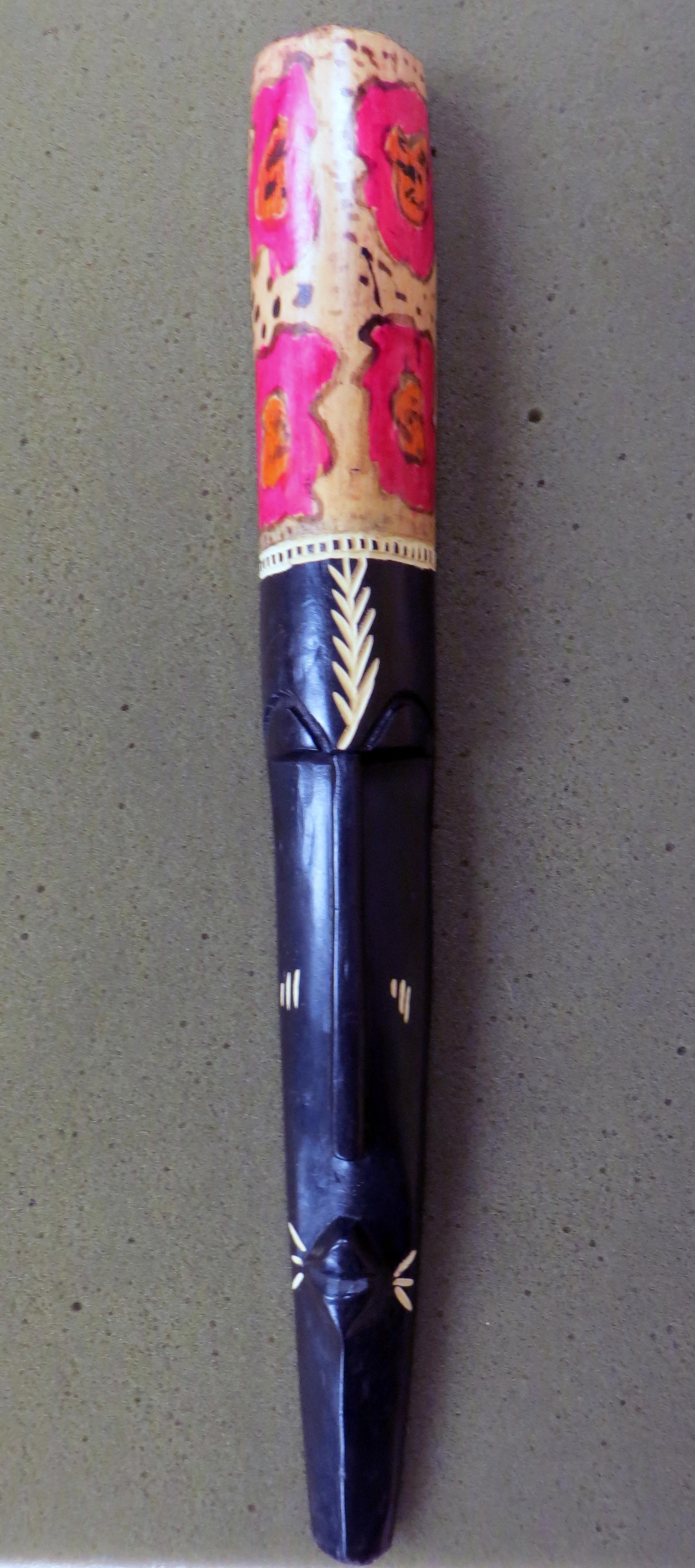 oblong mask that is wood and carved. Often time referred to as senupel mask. Has abstract art that looks like bacteria. With a green center circle and pink outside circle. There are four of them on the head with black dots and beige background. The rest of the mask is black with white carvings that look like plants 13inx1.5in