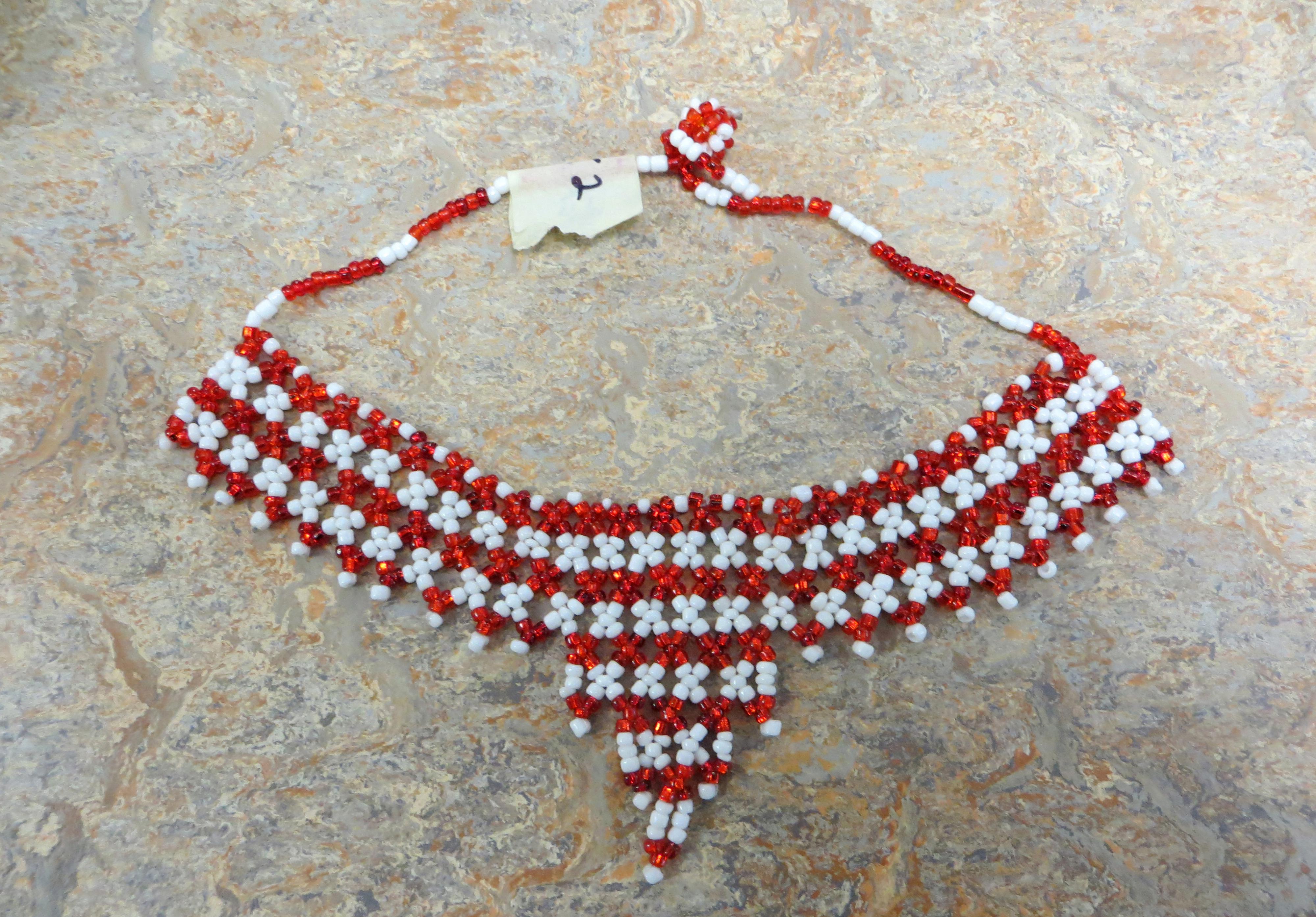 Red and white bead connected in a knot in the back by string. Made with 3 layers of crosshatching beads in different patterns. The middle contains more layers of beads, creating a pendant like shape. 16cm X 17cm dia.