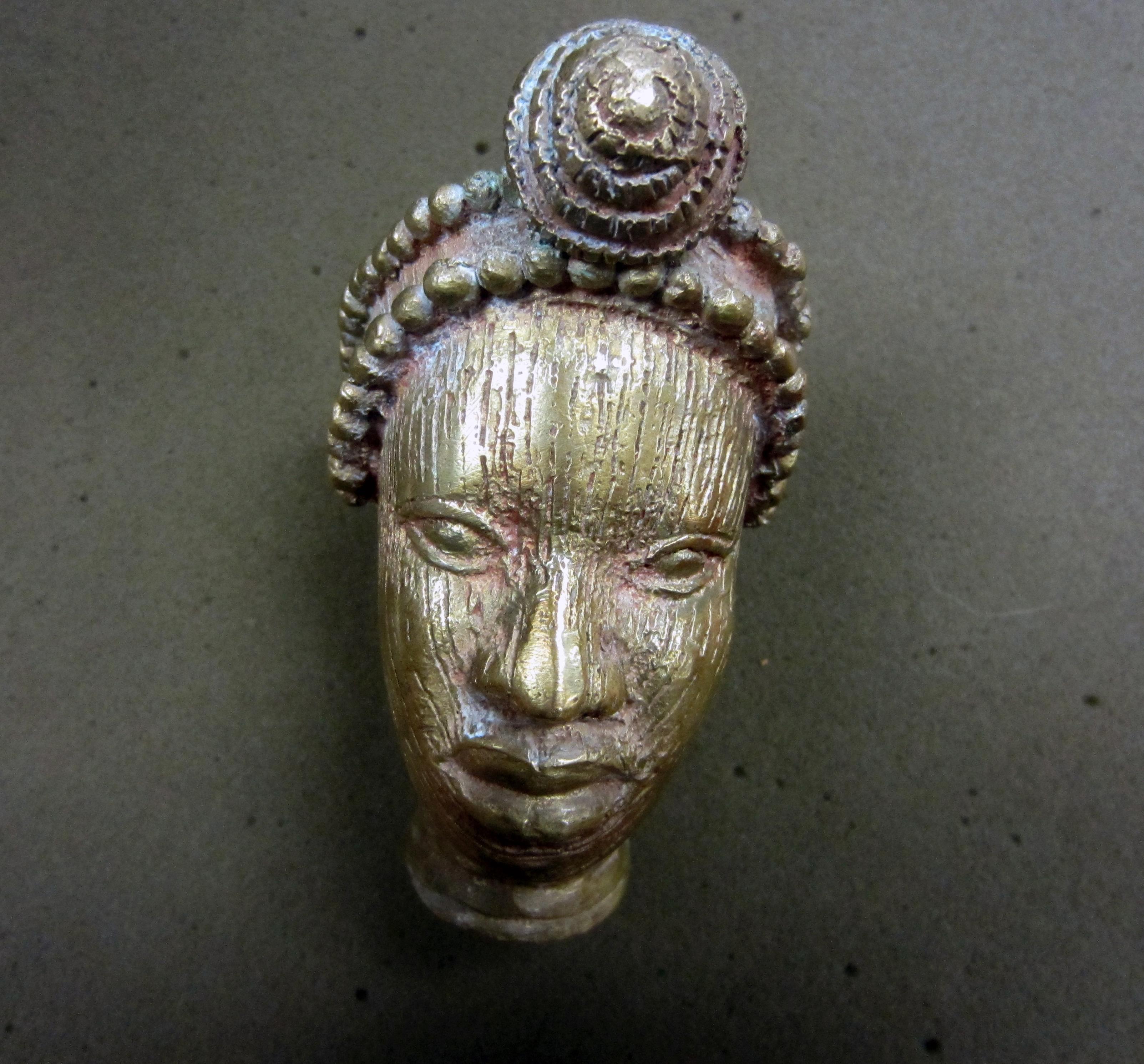 Metal sculpted head with missing top half. Hollow and golden in color, with decorative head piece on top; 4.5 in x 3.5 in x 2.5 in