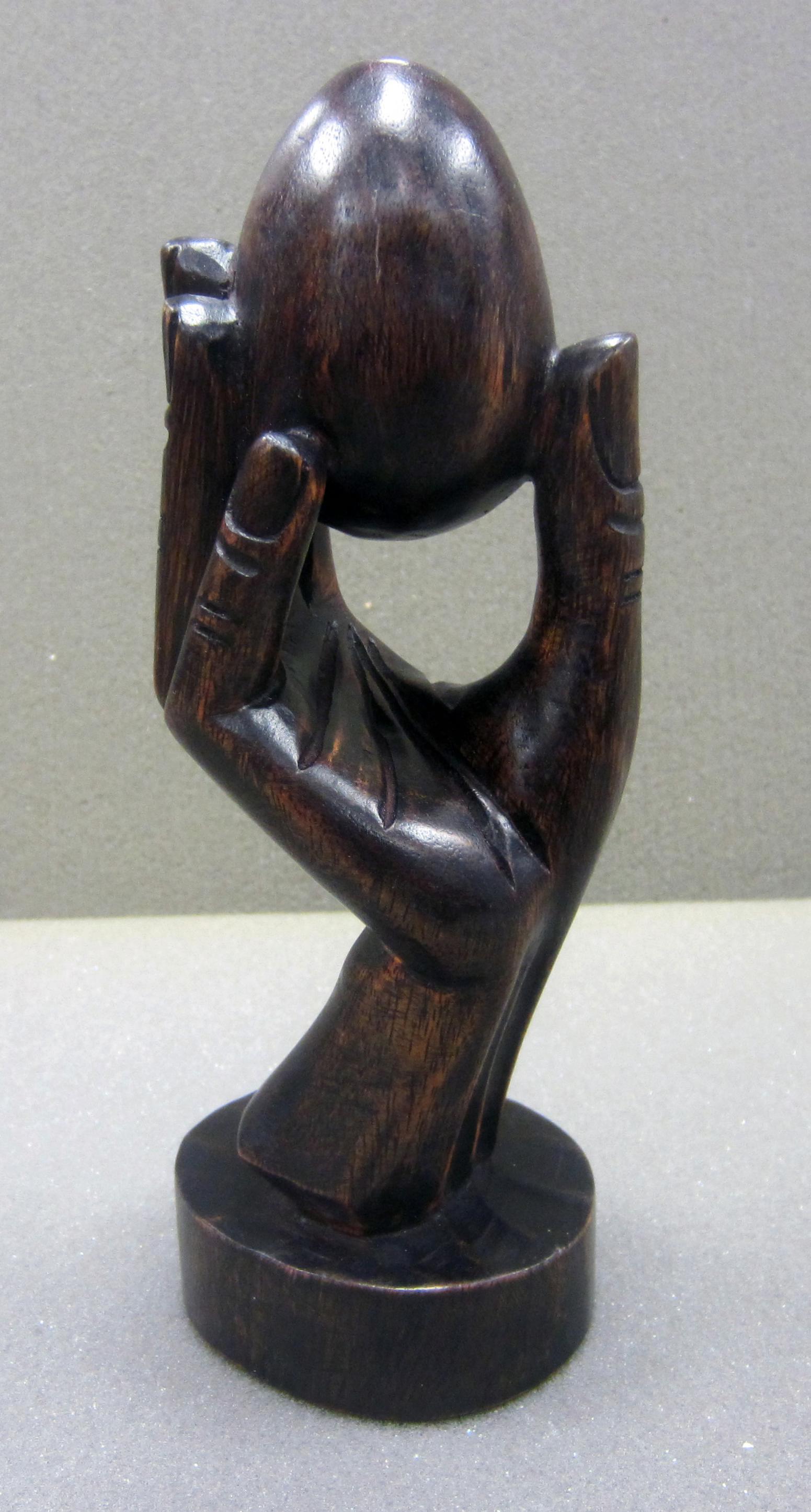 Carved, wooden sculpture of a hand holding an egg-like object. There is carved texture in the palm of the hand, as well as the finger nails and knuckles.12cmX7cm.
