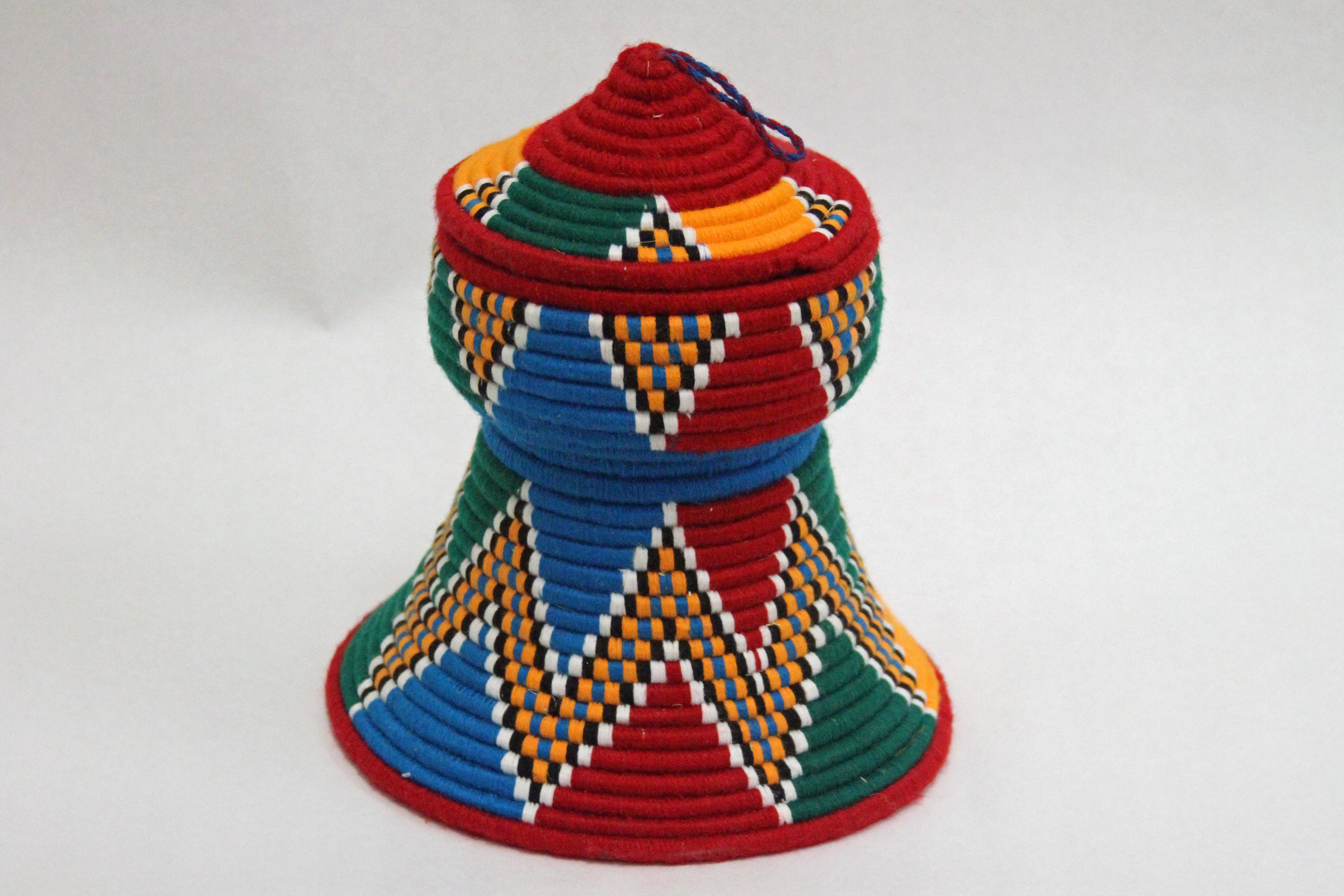 Woven vessel with removable top. Red, blue, white, yellow, green, and black stitching in repeated pattern. 24cm x 21cm dia.