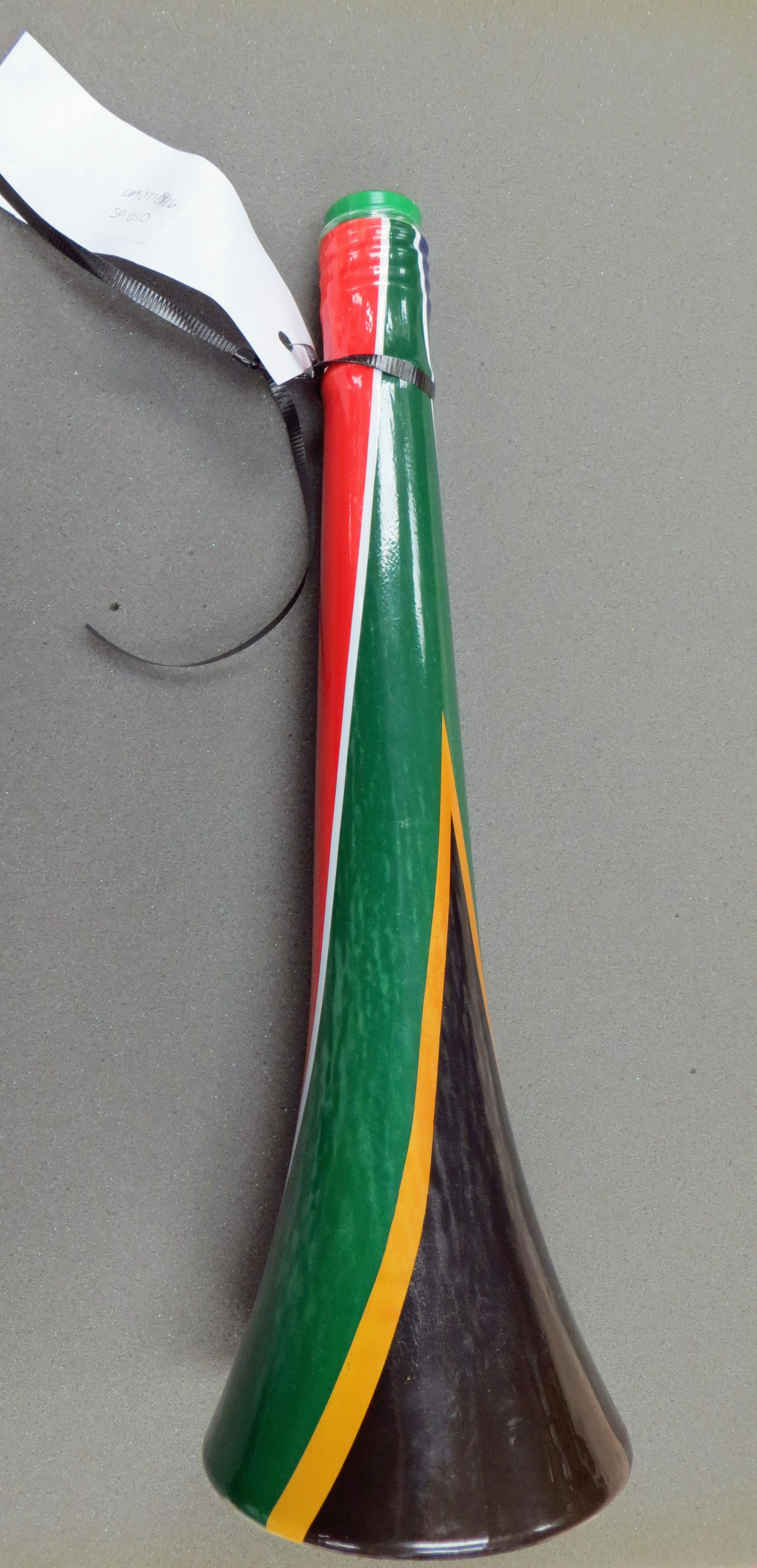Vuvuzela has a green tip to blow in, with a plastic sheet with a pattern on it. This vuvuzela is blue, white, red, green, gold, and black and made of plastic. It has kind of arrow shaped designs on the outside and Inside the horn is a small tube that looks like a small thin green pvc pipe. It was supposedly used during the 2010 soccer world cup. Traditionally the vuvuzela was inspired by a kudu horn and used to summon distant villagers to community gatherings. Today the Vuvuzela is mostly known for its use at soccer games. 13.5inx4in