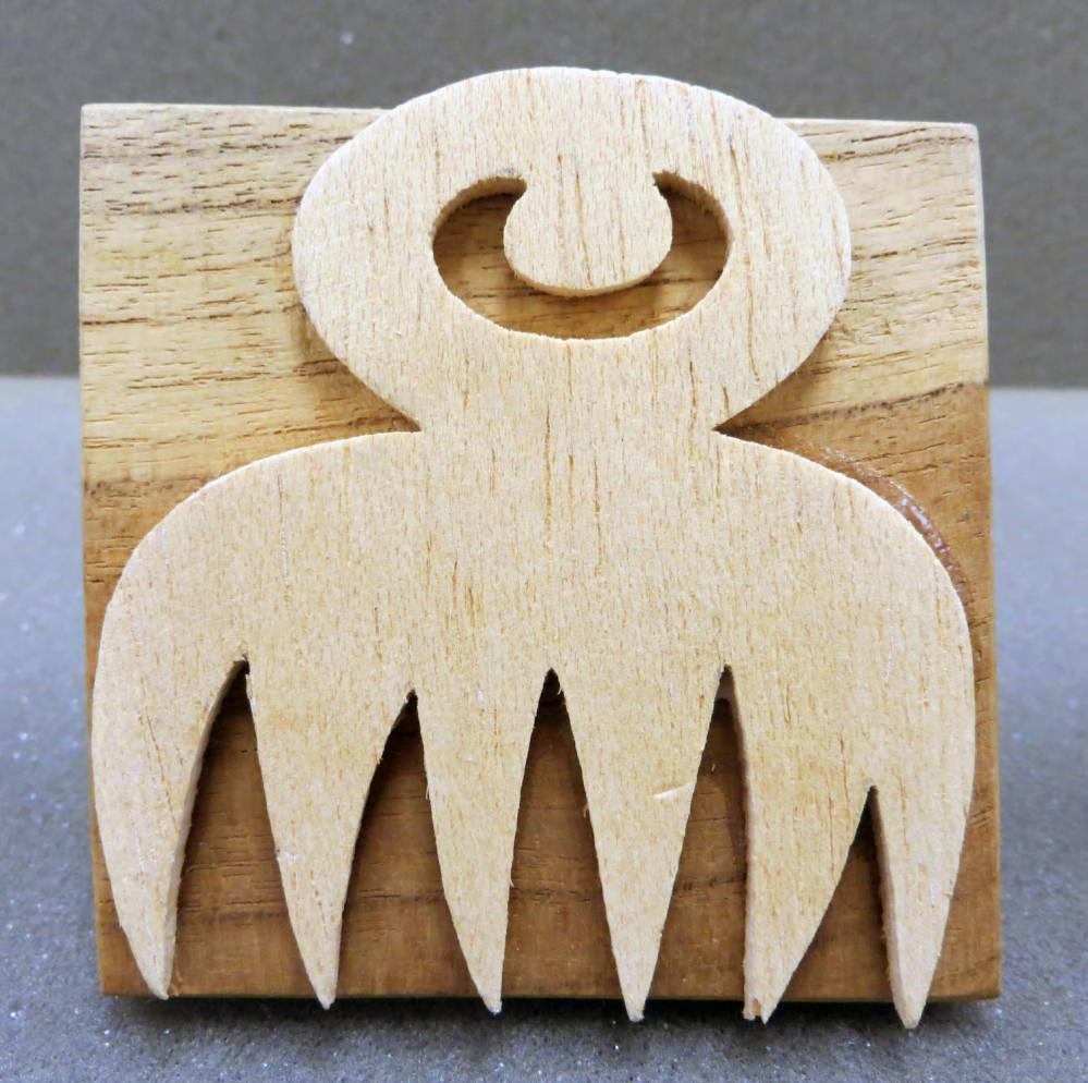 Wooden stamp: round top for grasping, comb like symbol which stands for Duafe which is known as the wooden comb. 3cmX3cm