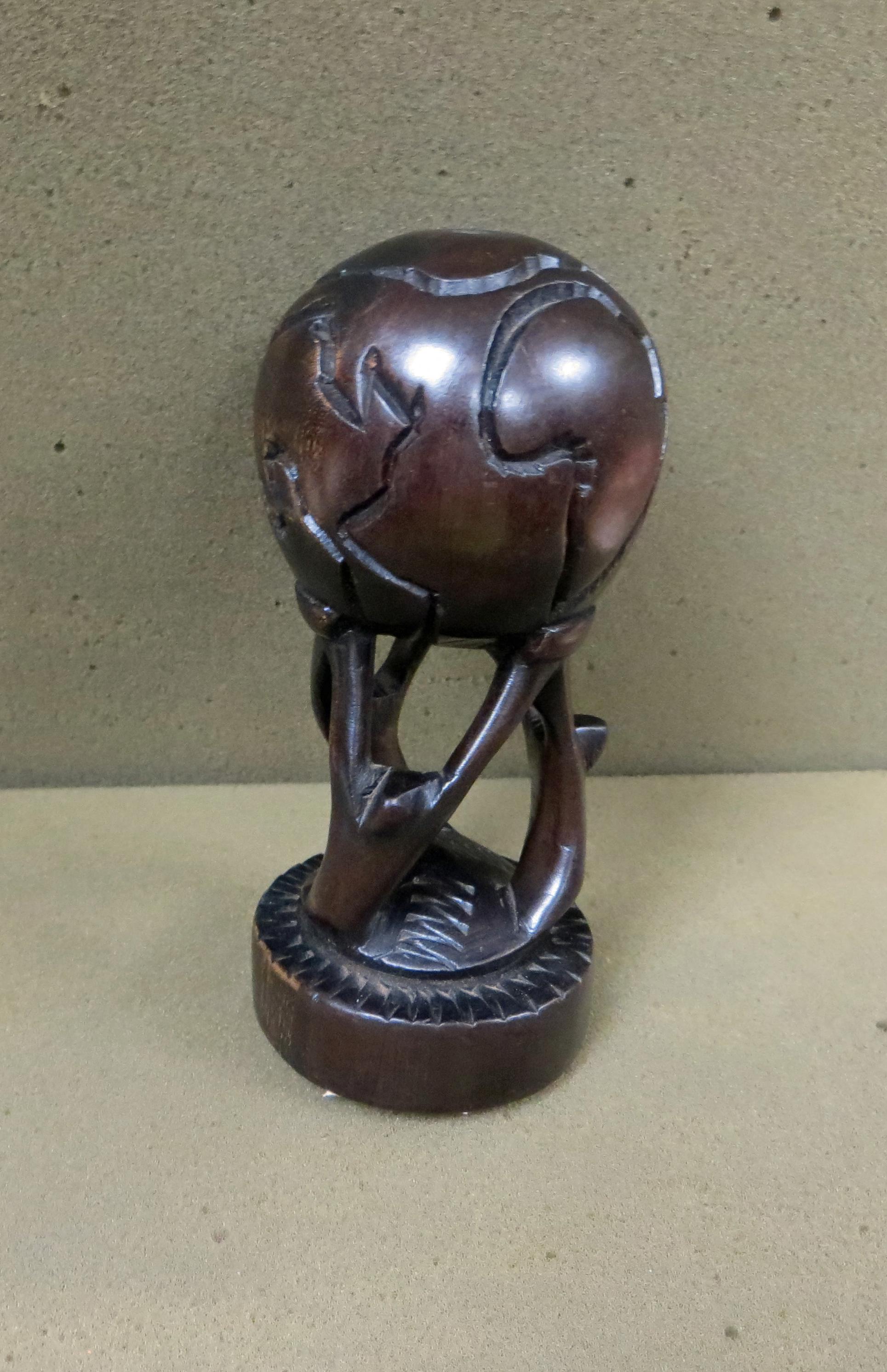 a small black wooden piece of Ghana art carved into the continent of Africa with three people holding up the continent of Africa to symbolize unity 6inx2.5in The piece shows a number of things and meaning. The piece is part of this unity identity and showing Unity carving is the most famous of Ghana's art work and their known for their beauty, and the difficulty of carving each one. The wood is taken from the roots of different baobab, redwood, and blackwood trees . This is made out of one entirely out of one piece of wood. Symbolize the African struggle for freedom, and also represent the unity of the people. The world on top shows how far reaching that this idea is and can travel. But most importantly the globe shows Africa in case showing that they were more focused on Africa.