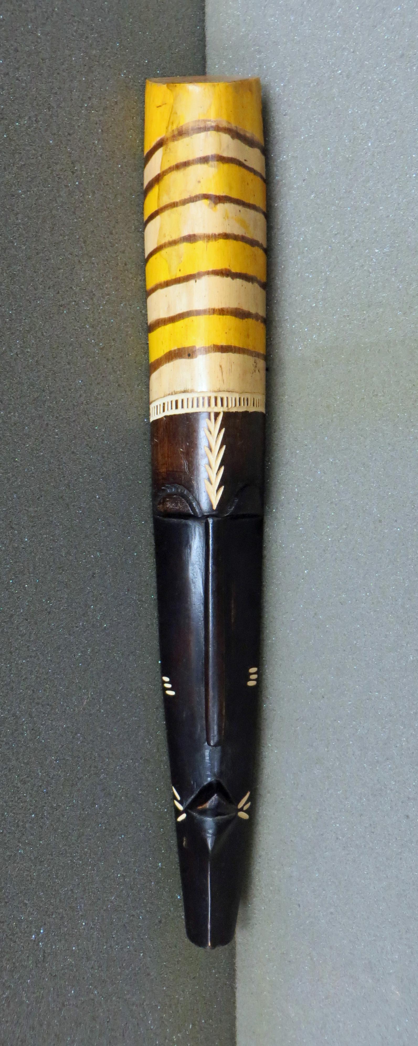oblong mask that is wood and carved. Broke up in three colors. The head is yellow and beige in alternation until you reach just above the eye and the rest of the piece is the black. The carvings are throughout the mask that are white and far more indented in the wood. Looks like plants12.5inx175in