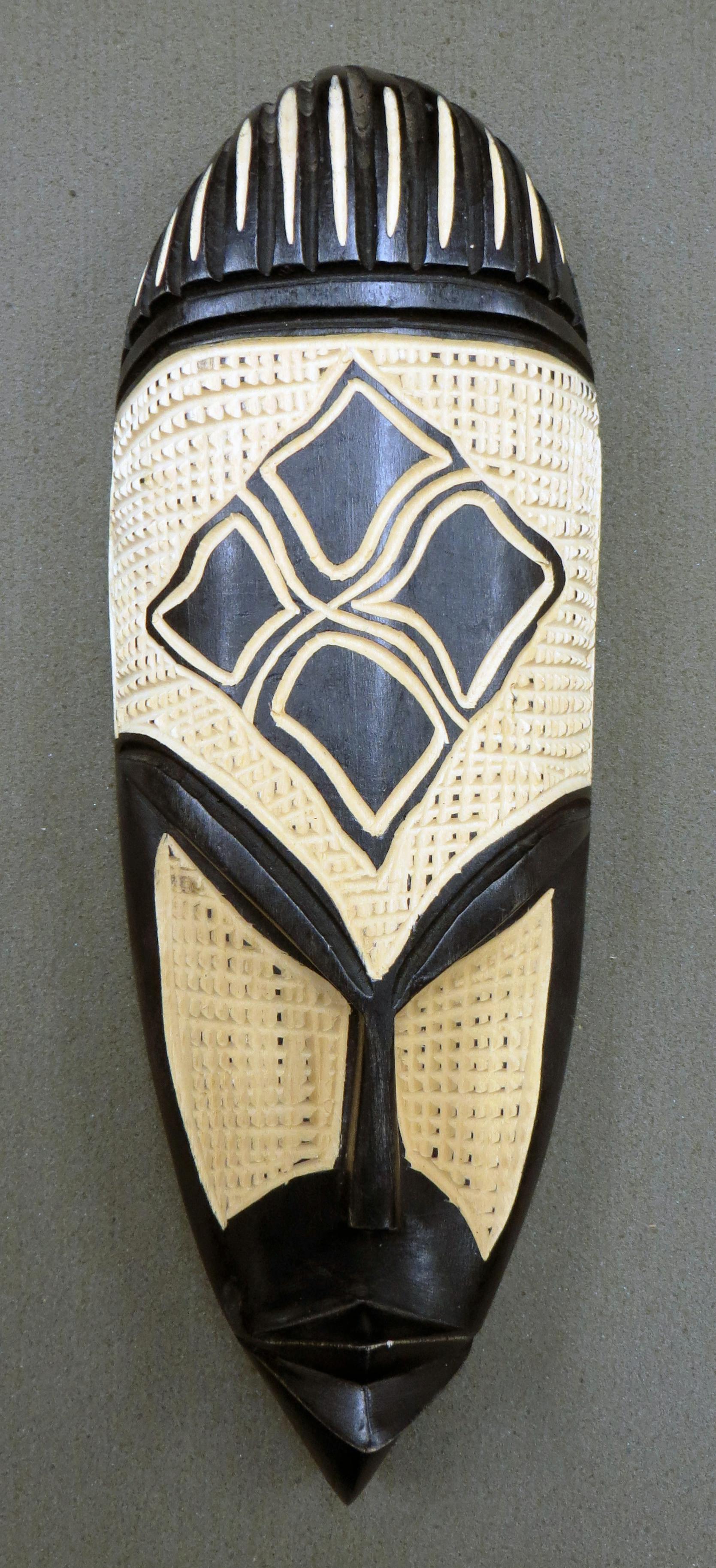 Carved wooden black mask with a Eban symbol carved on top and different accents throughout. 28mm x 9.5mm x 3.5mm