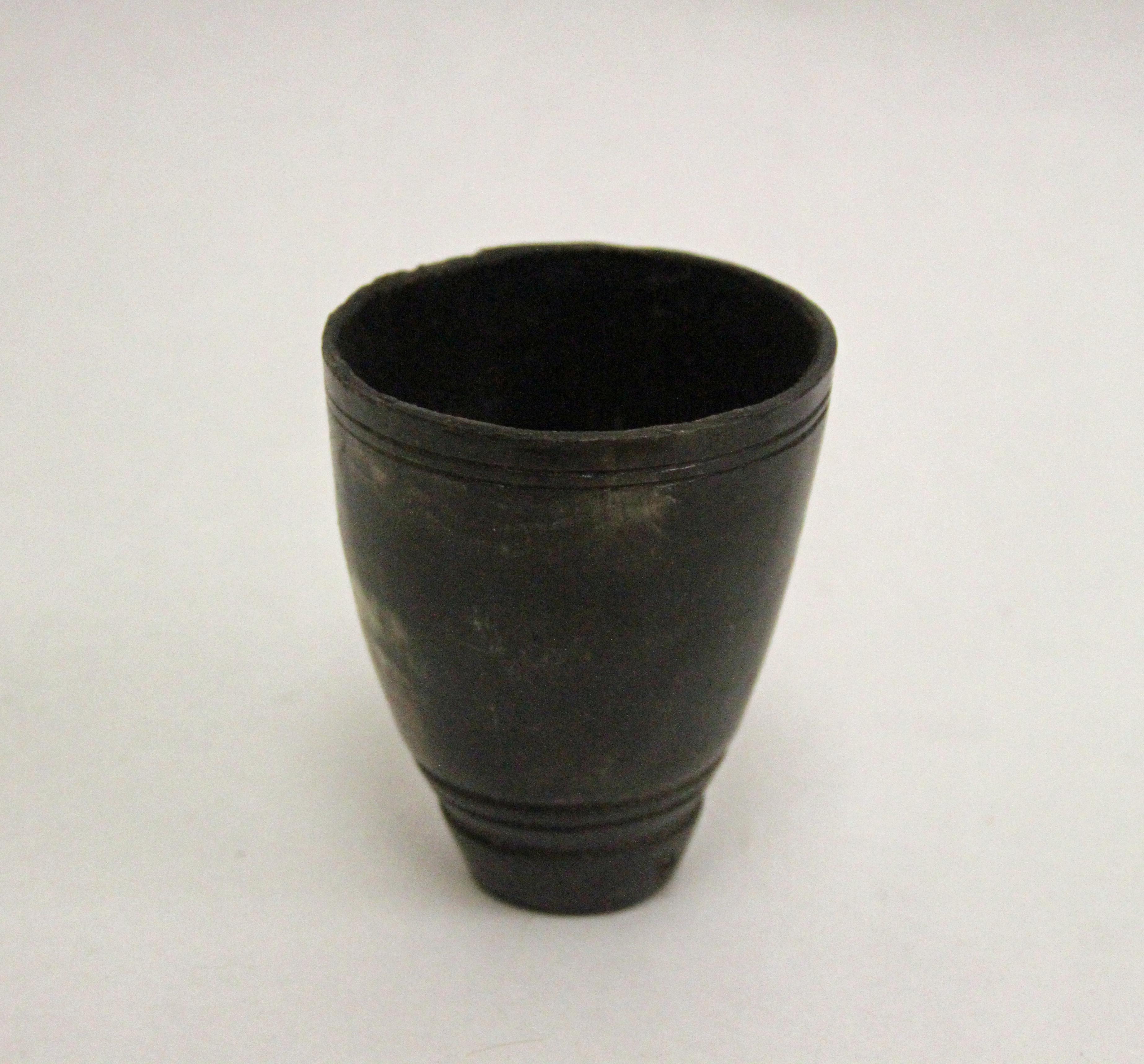 Vessel carved out of animal horn with rings carved around brim and base. Dark in color with some white showing through on one side. 4in x 3in