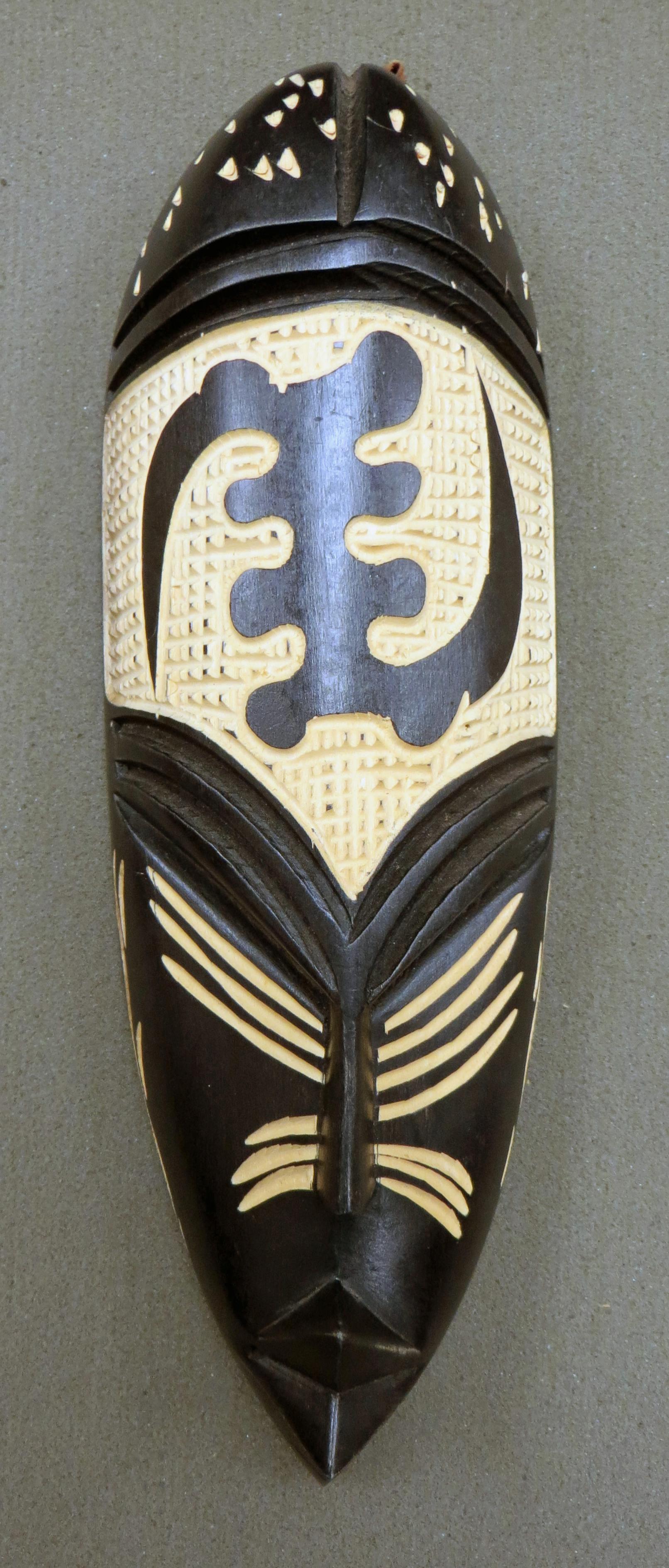 Carved wooden black mask with a Gye Nyame symbol carved on top and different accents throughout. 25.5mm x 8.5mm x 3.5mm