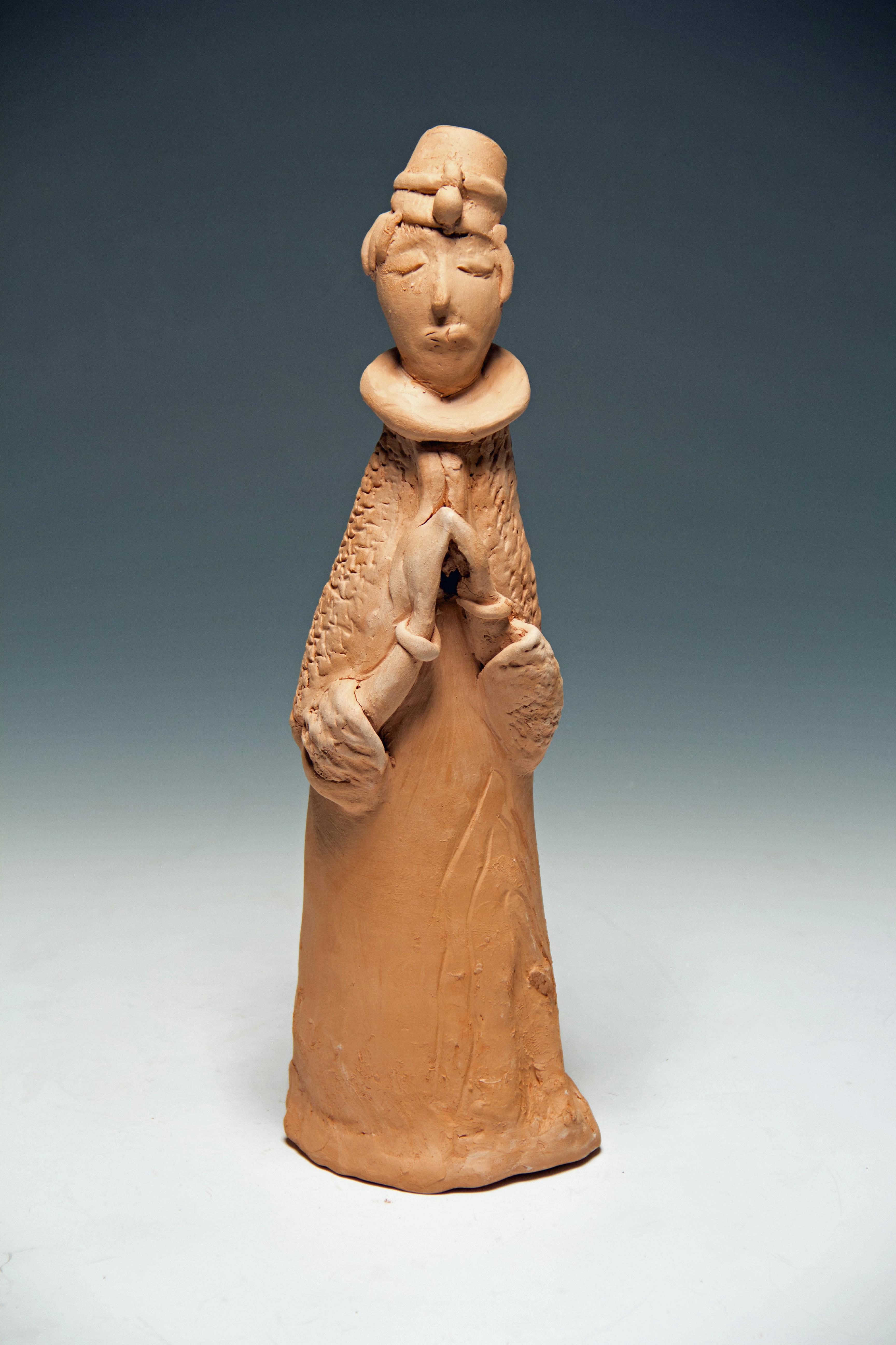 Red clay statue. Person dressed in religious clothing. Hands in worship. 39.4 cm x 11.4 cm