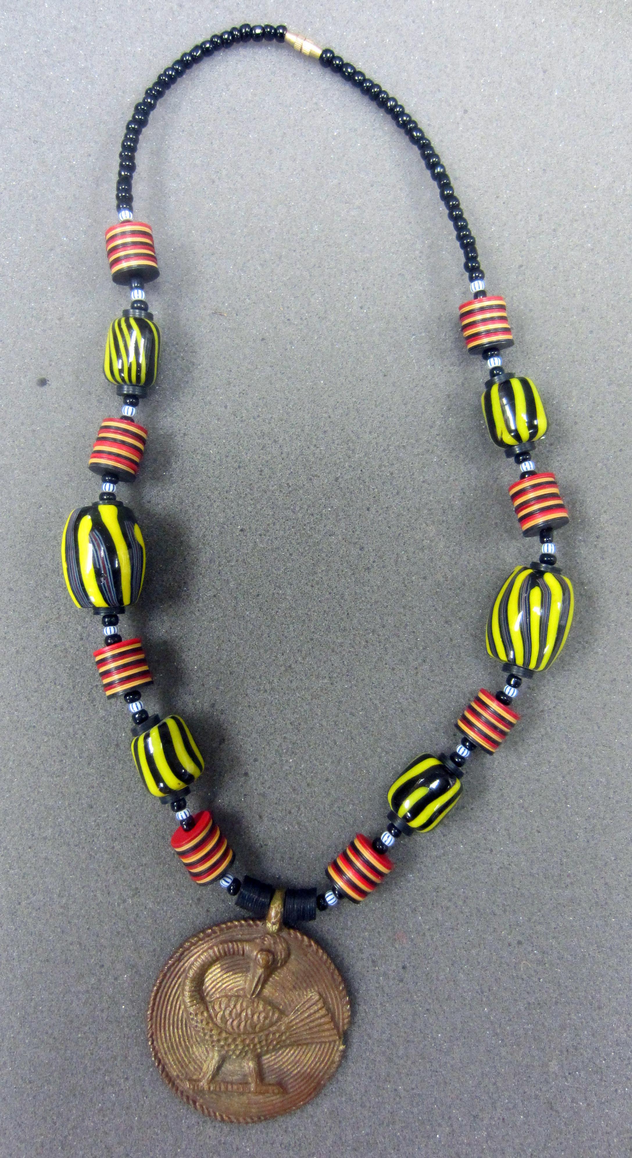 Necklace with a gold medallion with the Sankofah symbol in the center; the base is composed of small, black beads; black, yellow, red; 6 cylindrical stone beads with black and yellow stripes, 2 of which are larger than the others; 8 stacks of disk-like beads in black, red and yellow.31cmX5cm.