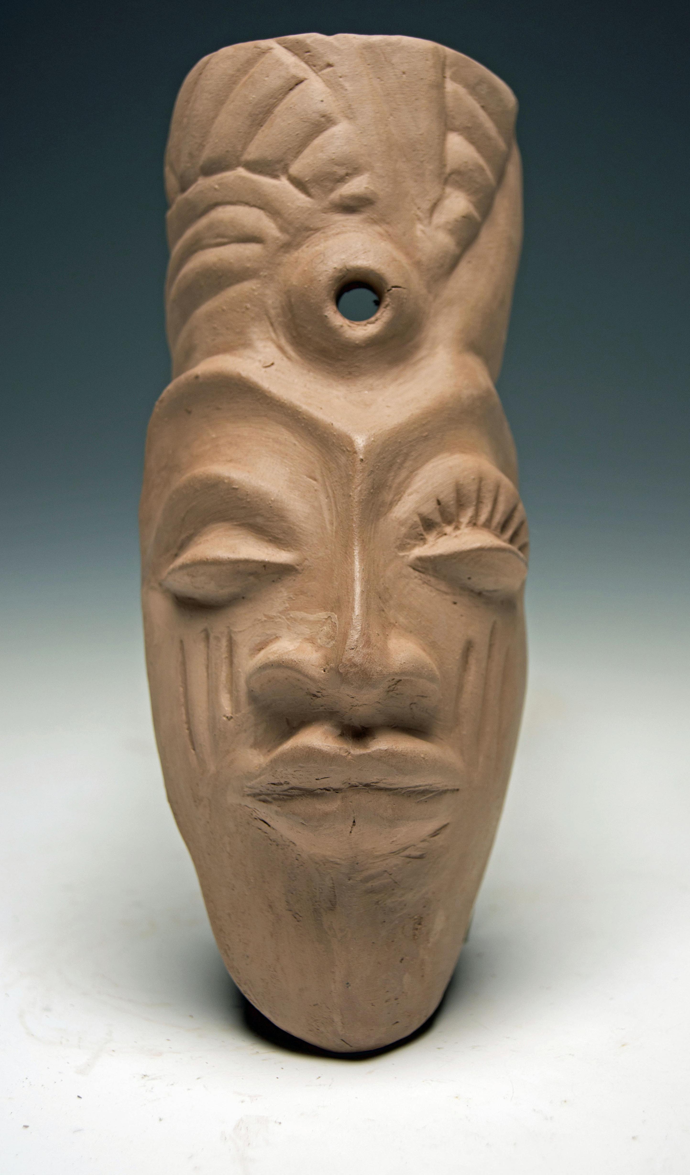 Red clay, One eye has lashes, Engravings representing paint on face. This red clay mask seems to come from the Nok society in Nigeria, along with others from this collection. A strong indicator of this is the red clay used to construct the mask. 19 cm x 7.6 cm