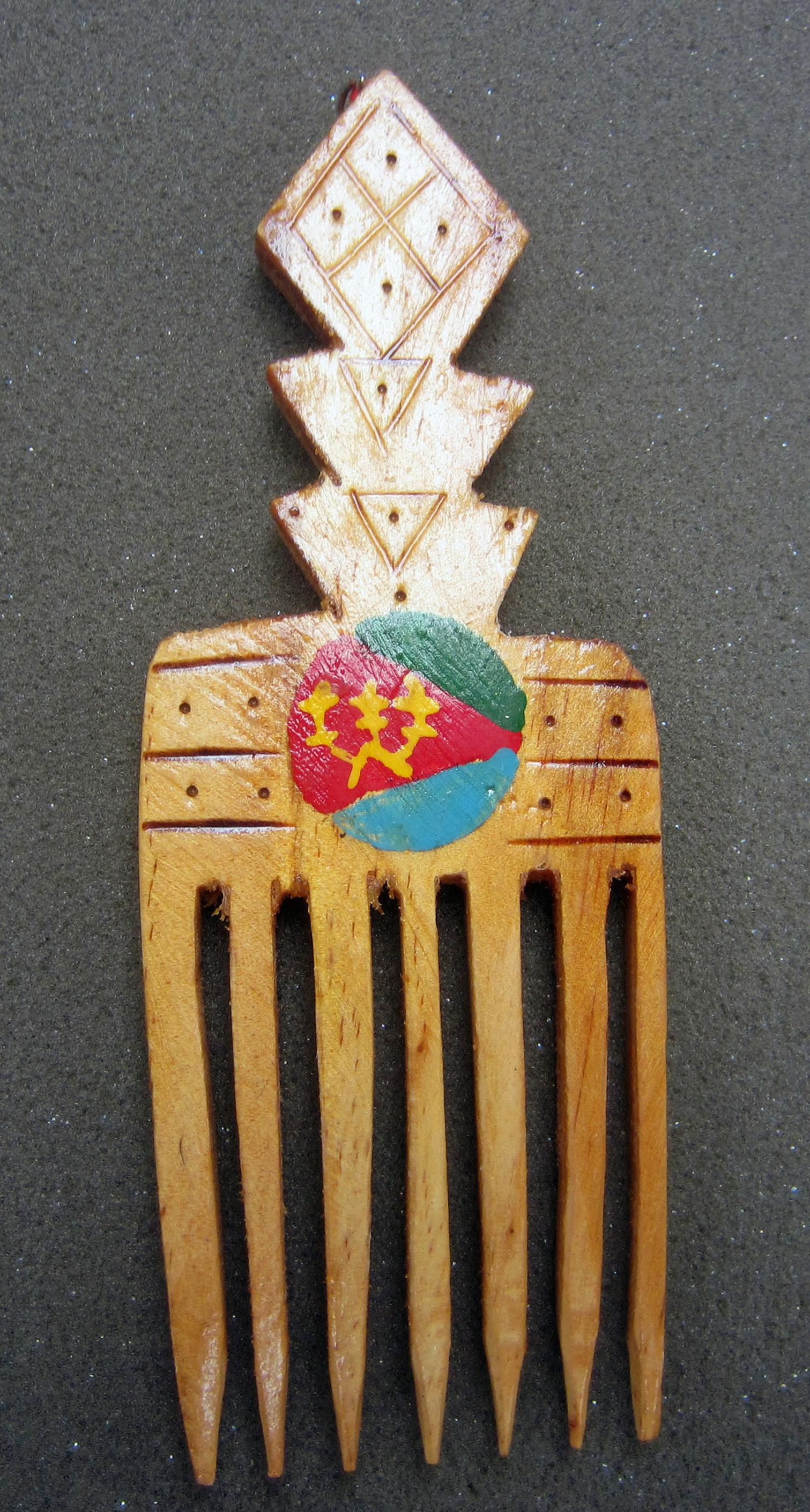 Wooden comb with carved handle and 7 wooden tines and green, red, blue, and yellow symbol representing the Eritrean flag in the middle and carvings throughout. 15.25cm X 5.5cm dia.