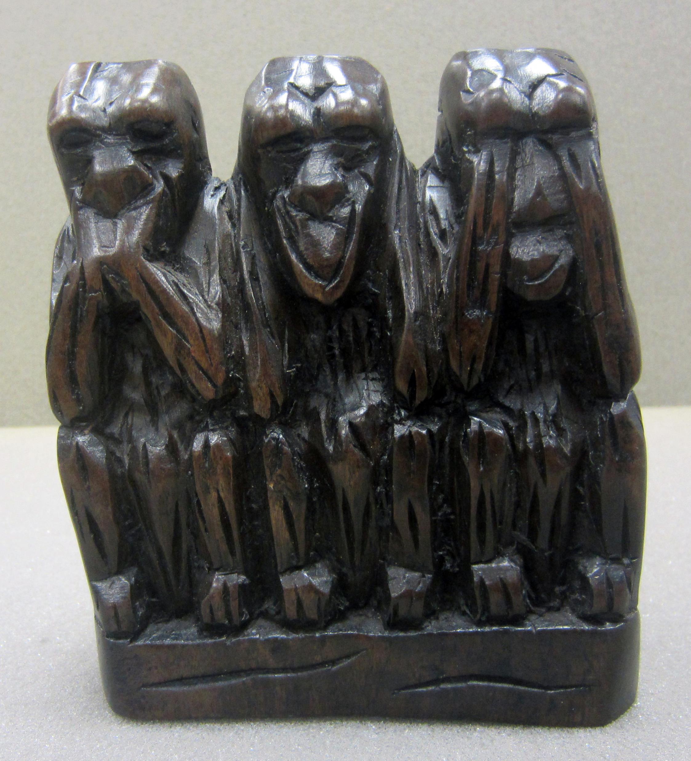 Carved, wooden sculpture of three monkeys; the first (from left to right) covering its mouth, the second its ears, and the third its eyes with their hands. The tops of the monkeys' heads are flat. 13cmX11.25cm