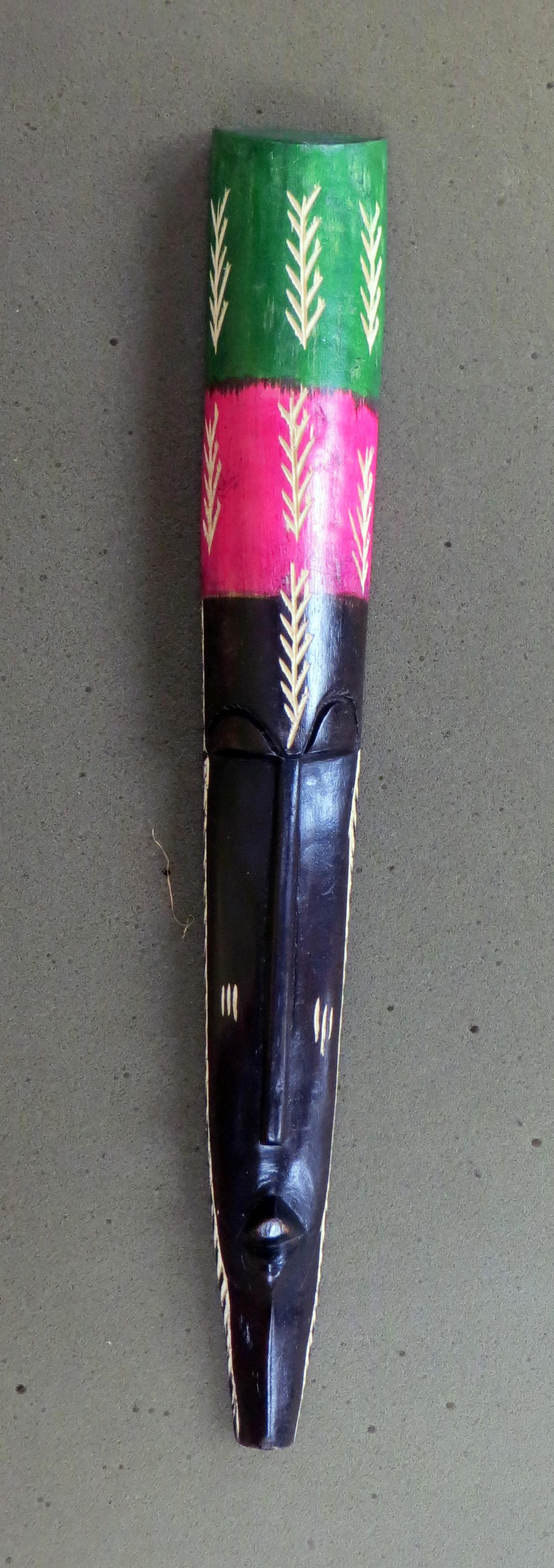 oblong mask that is wooden and carved. Broke up in two colors of the head; green and pink and the rest of the mask is black. The carvings in the mask are white and located on the edges and on the head pieces for decoration which looks like a line with angled lines protruding 14.25inx1.5in