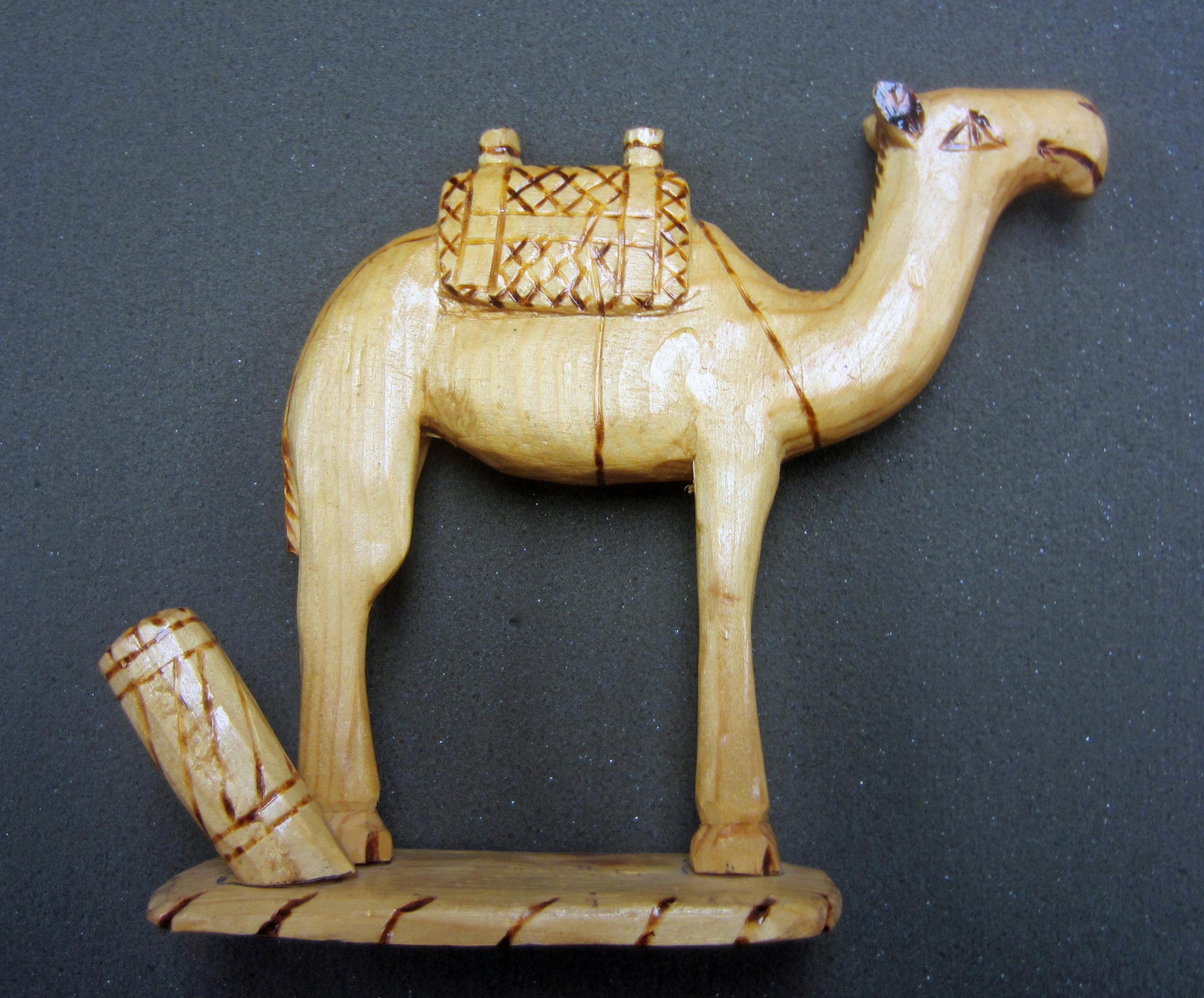 polished wooden carving of a camel with a pack on the back. Screws hold the camel to its base along with a wooden pylon next to it. (role of transportation) 16.5cm X 19cm dia.