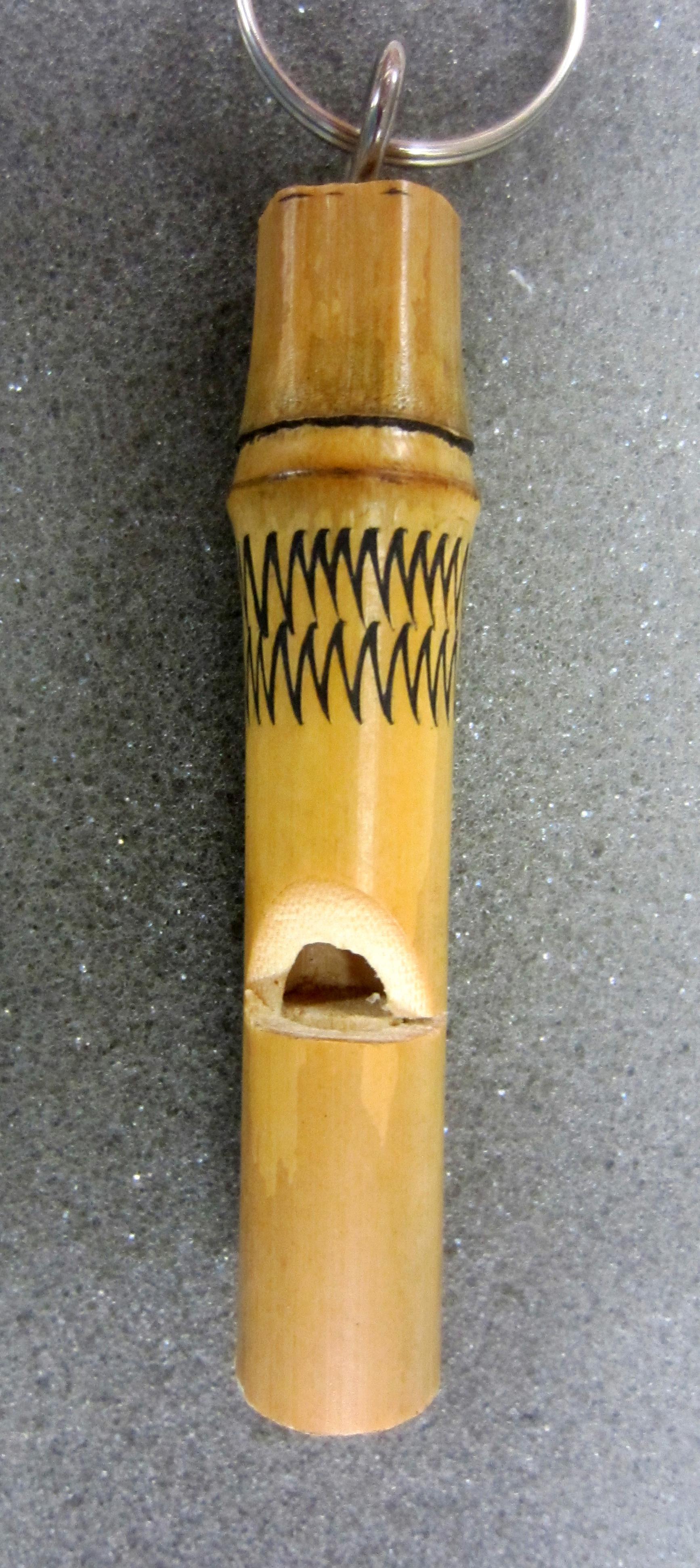 Bamboo whistle with double zigzagging lines around the body. Metal keychain attached at end. 4in x .5in