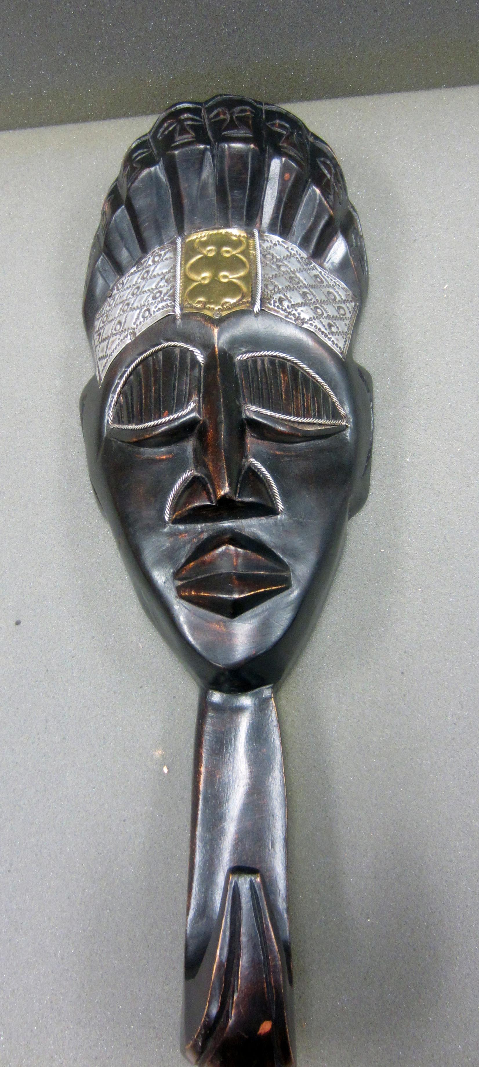 Wood mask stained black with eyes and nose lined with silver braid. Forehead has silver and gold band. Has coat hanger on bottom. 42 cm x 15.2 cm