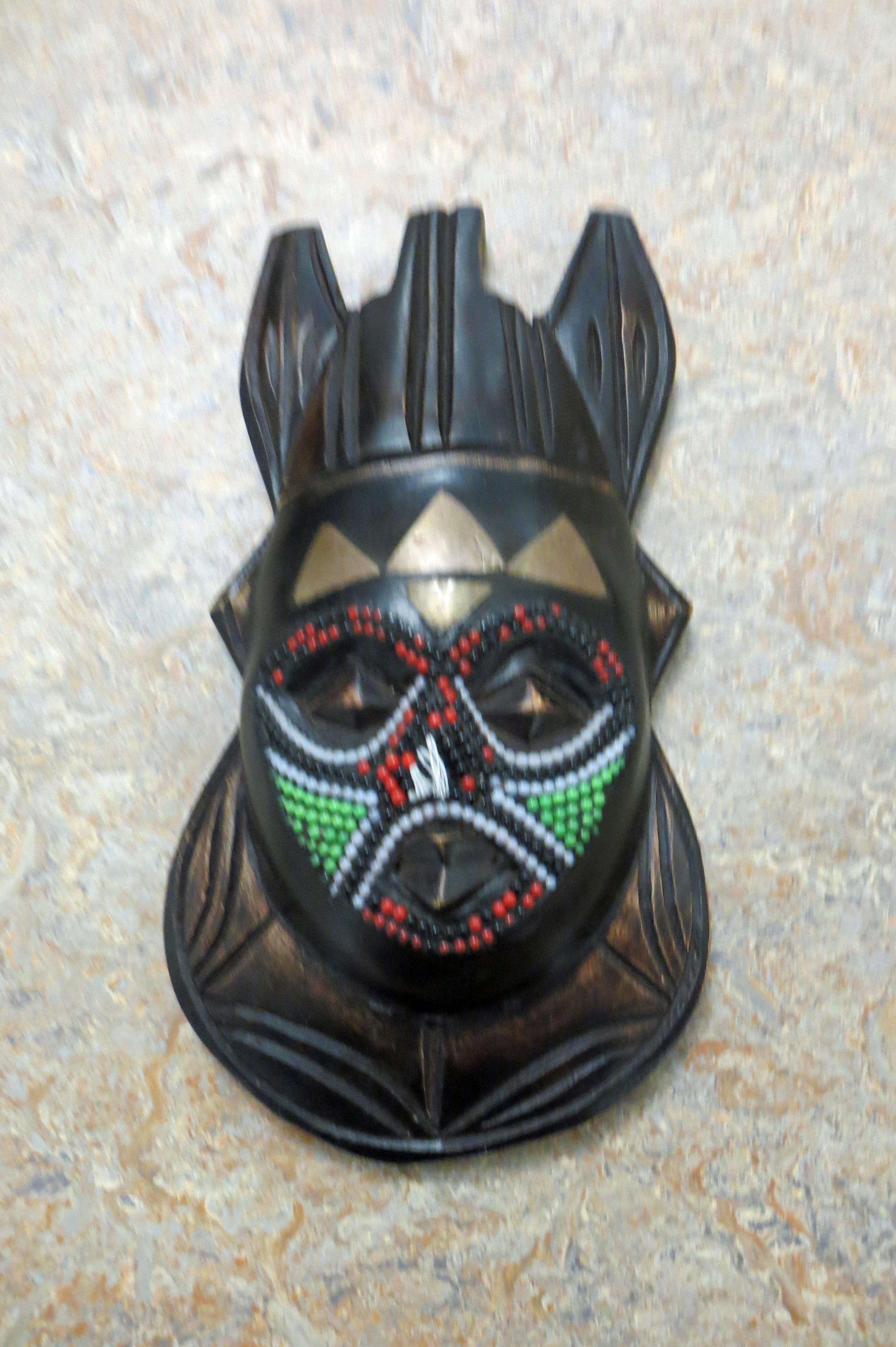 a small wooden mask that has carvings. Bronze triangles that are inverted and a colorful beads that go around the eyes, mouth, and much of the nose. Black, green, blue, red and yellow are the colors depicted. The mask looks as if it is wearing a crown and looks similar to the lulua masks. 9inx5in