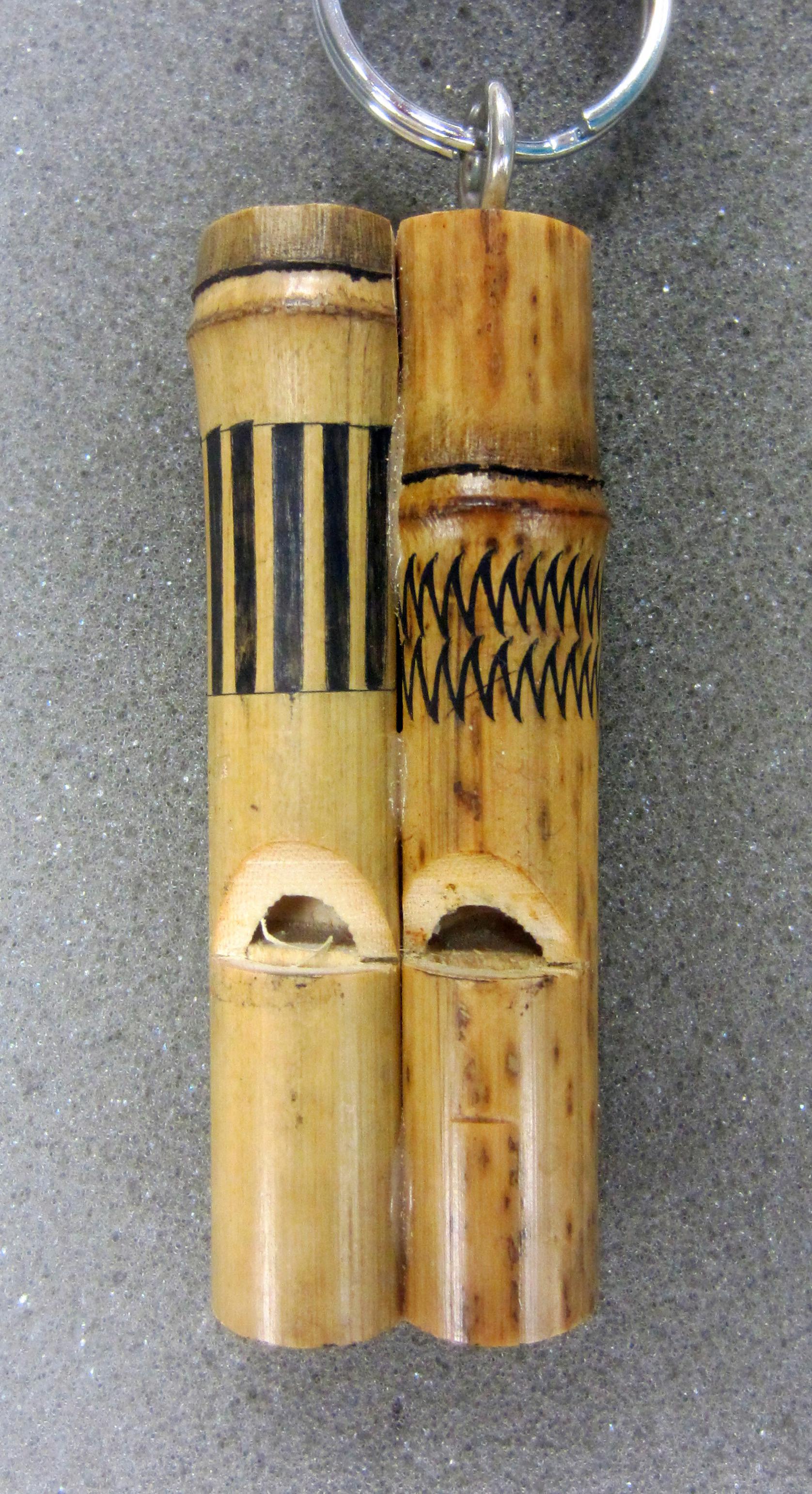 Two bamboo whistles glued together with different patterns on each. Metal keychain attached at the end. 4in x 1in
