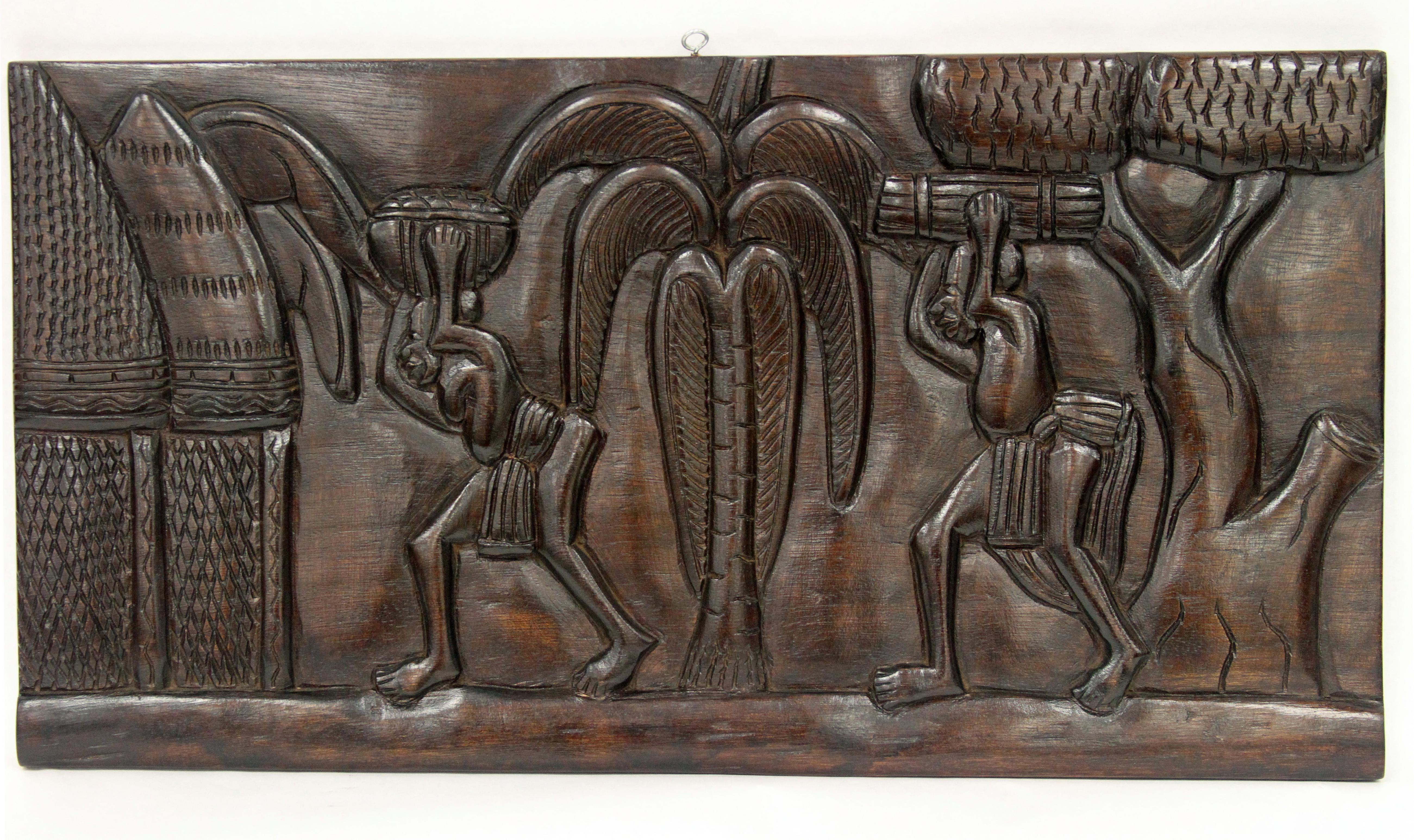 Wooden wall sculpture depicting a man and woman carrying objects on their heads. Huts and trees are present in the background. 21.5in x 11.5