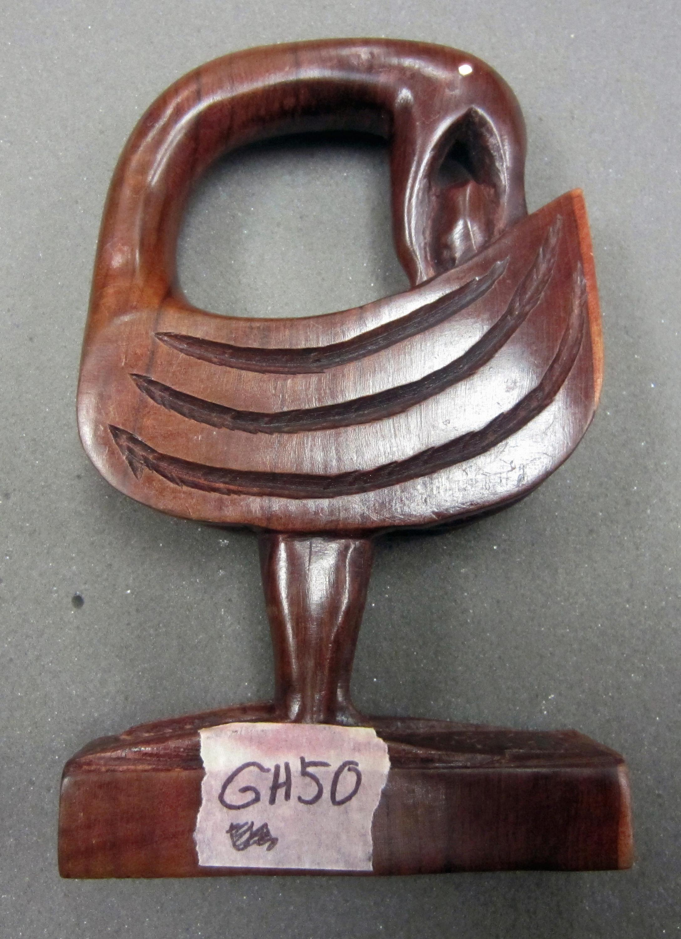 Carved wooden Sankofa bird with object in beak and painted on eyes with a rectangular base; 16.5mm x 10mm x 3mm