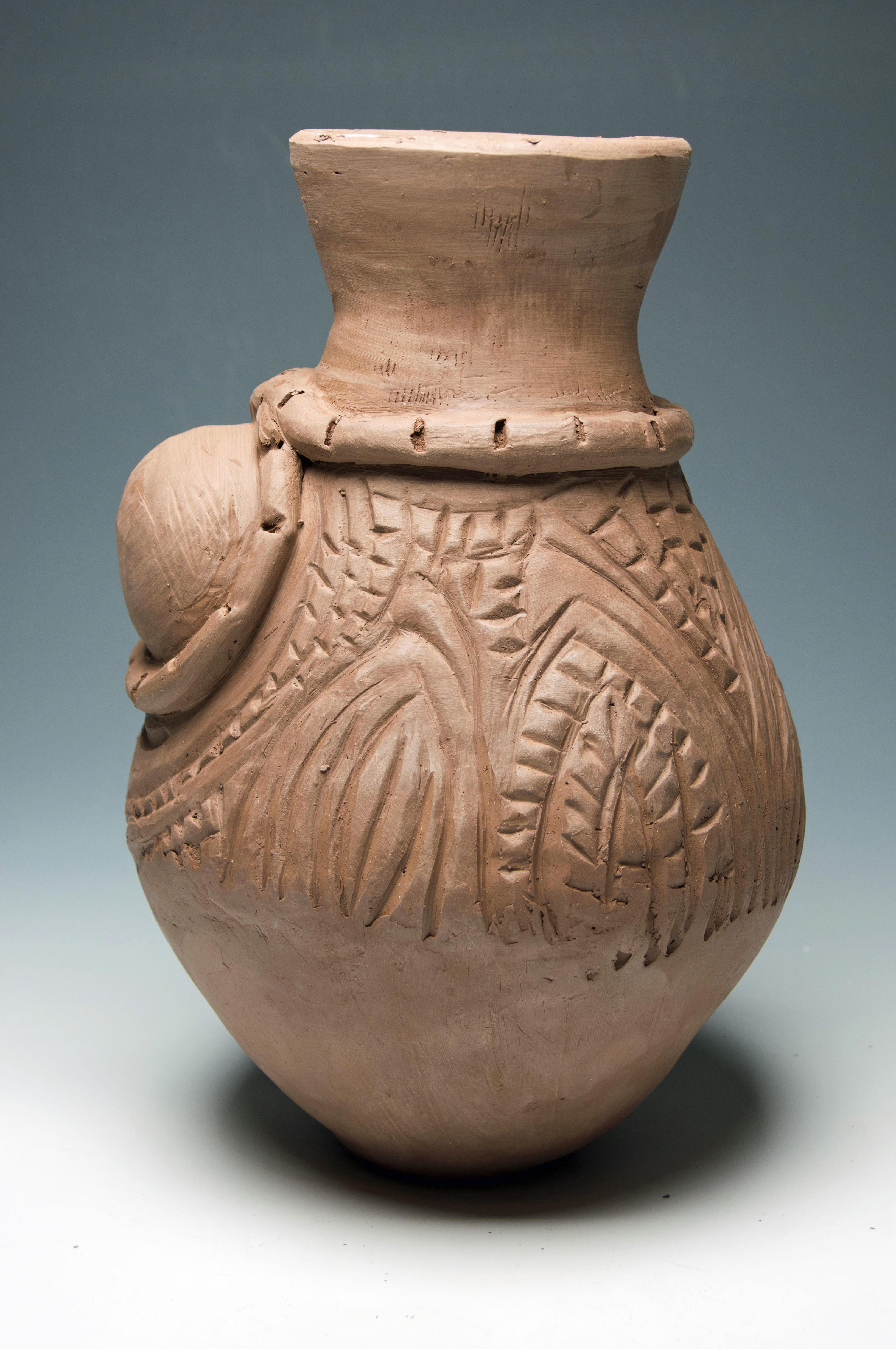 Red clay jug. Rope necklace around neck. Also a bigger artifact and vessel for carrying water. Has more prominent display of art around the outside. 34.3 cm x 20.3 cm