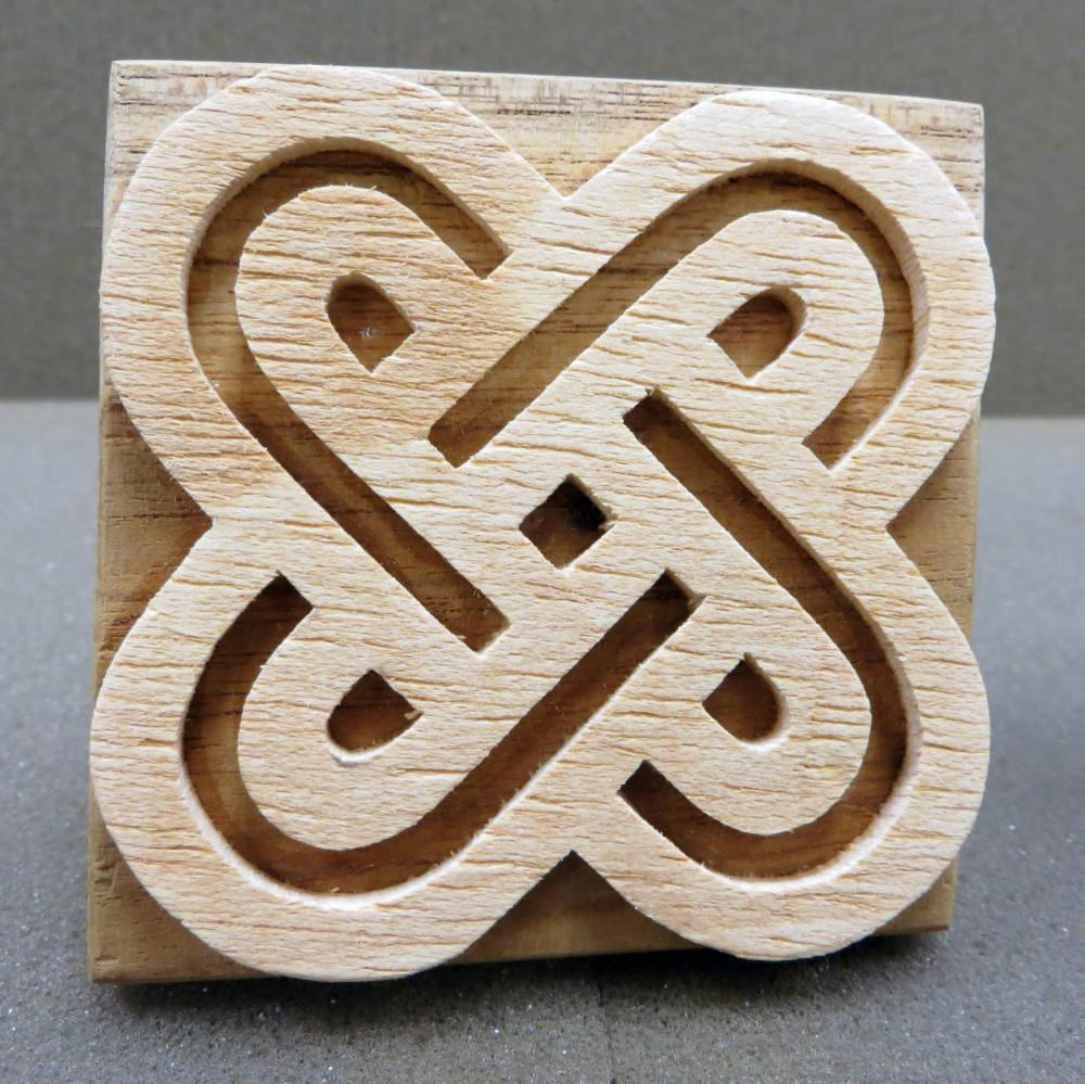 Wooden stamp; round top for grasping; maze like symbol, Symbol is Kramo bone amms yeannhu kramo pa which means we cannot tell the good from the bad because of pretense of hypocrisy. 3cmX3cm