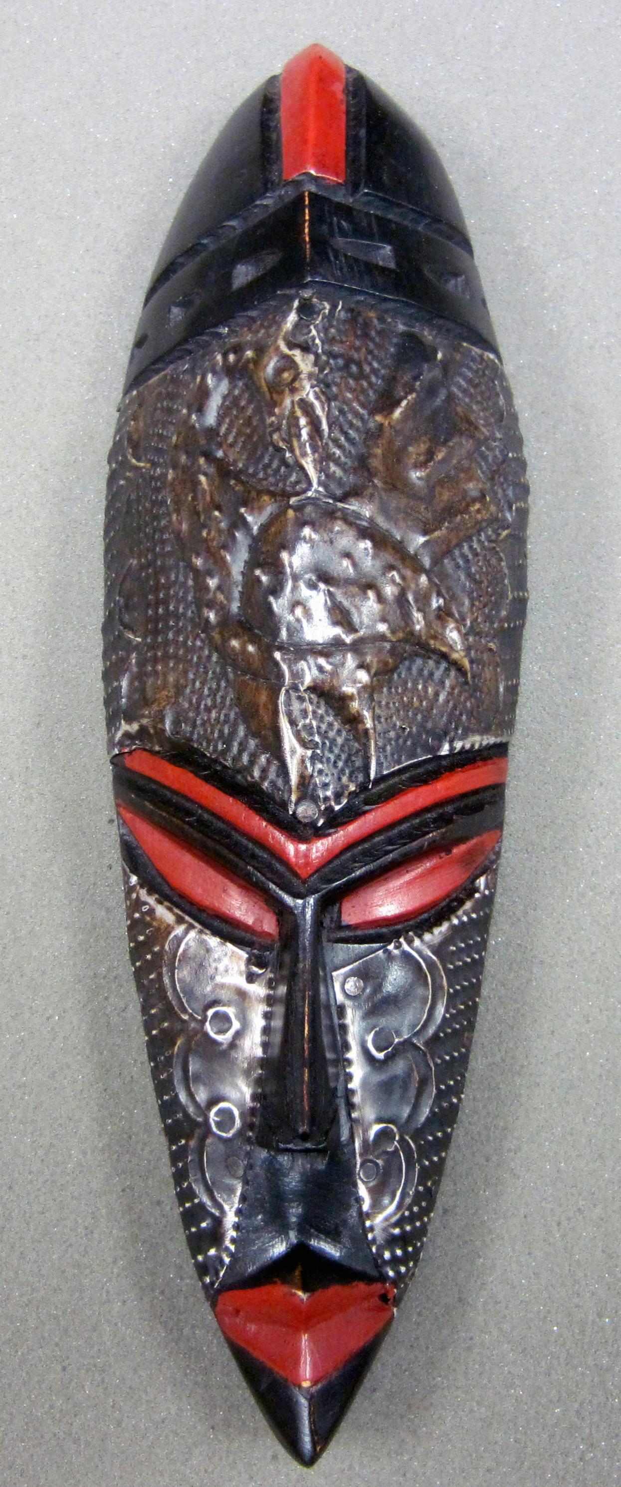 Carved wooden mask with a metal accent on top with a bird and other metal accents throughout. 28.5mm x 8.5mm x 5mm