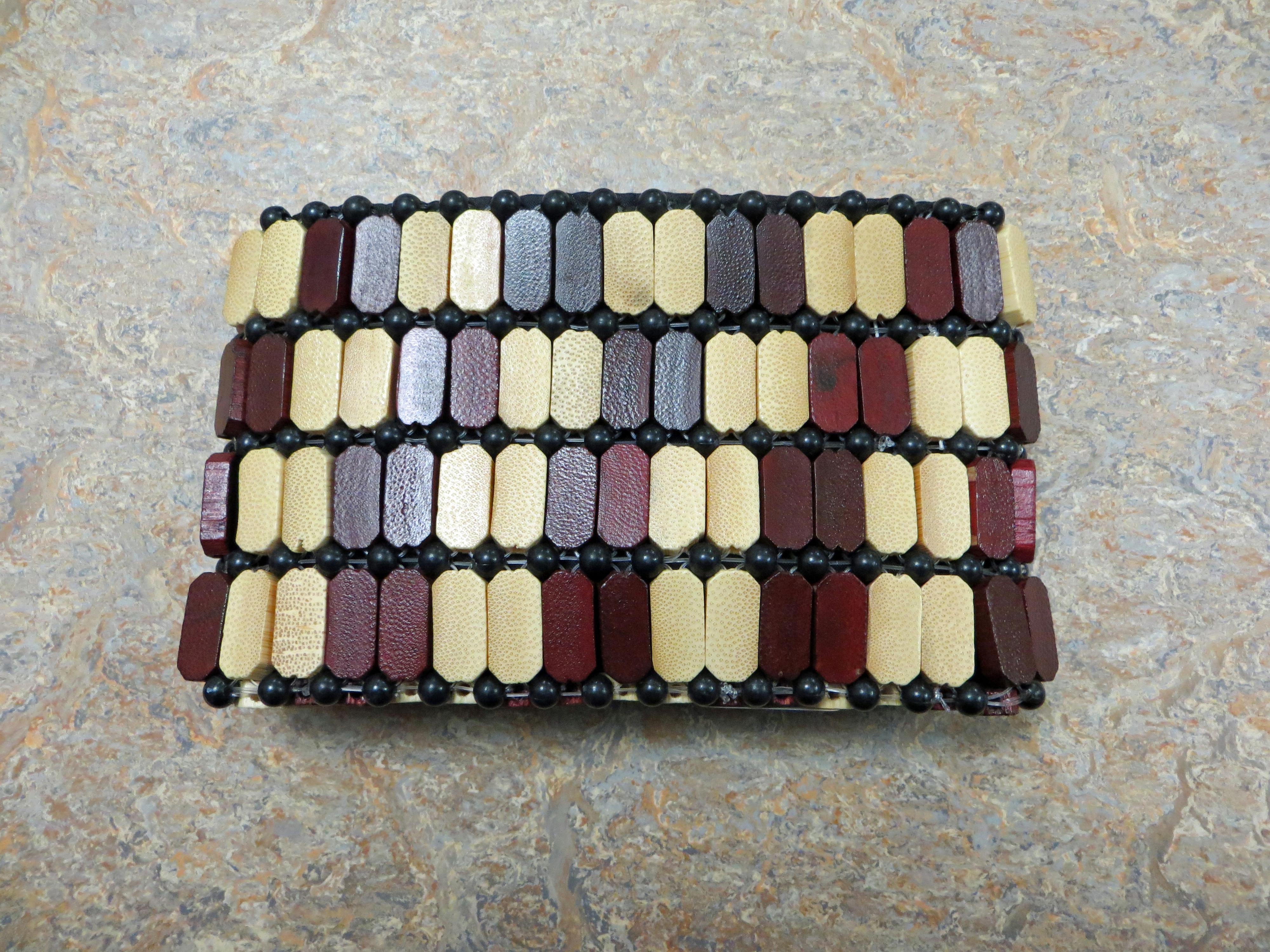 A brown, tan, black, beaded wallet, that can be used for men or women. 16cm x 10cm dia.