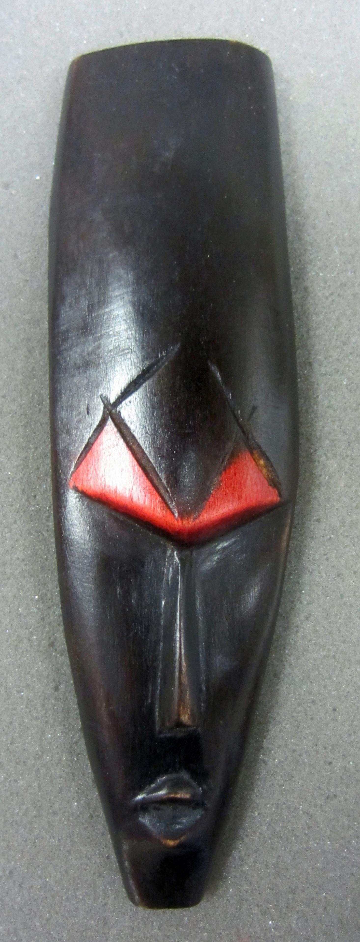 Carved wooden mas, painted black with red eyebrows; both the top and bottom edges are squared off. 19cmX5.5cm