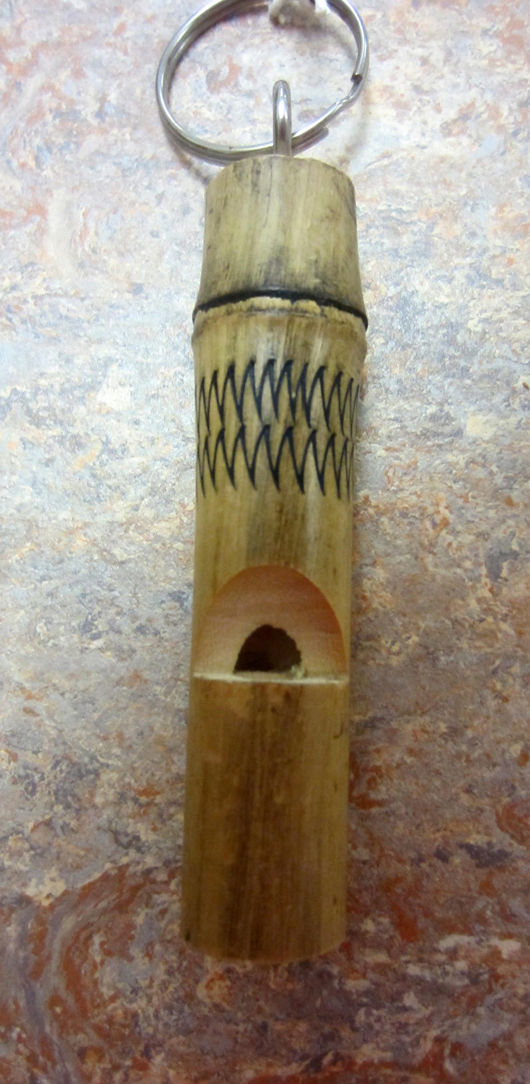 Bamboo whistle with double zigzagging lines around the body. Metal keychain attached at end. 4in x .5in