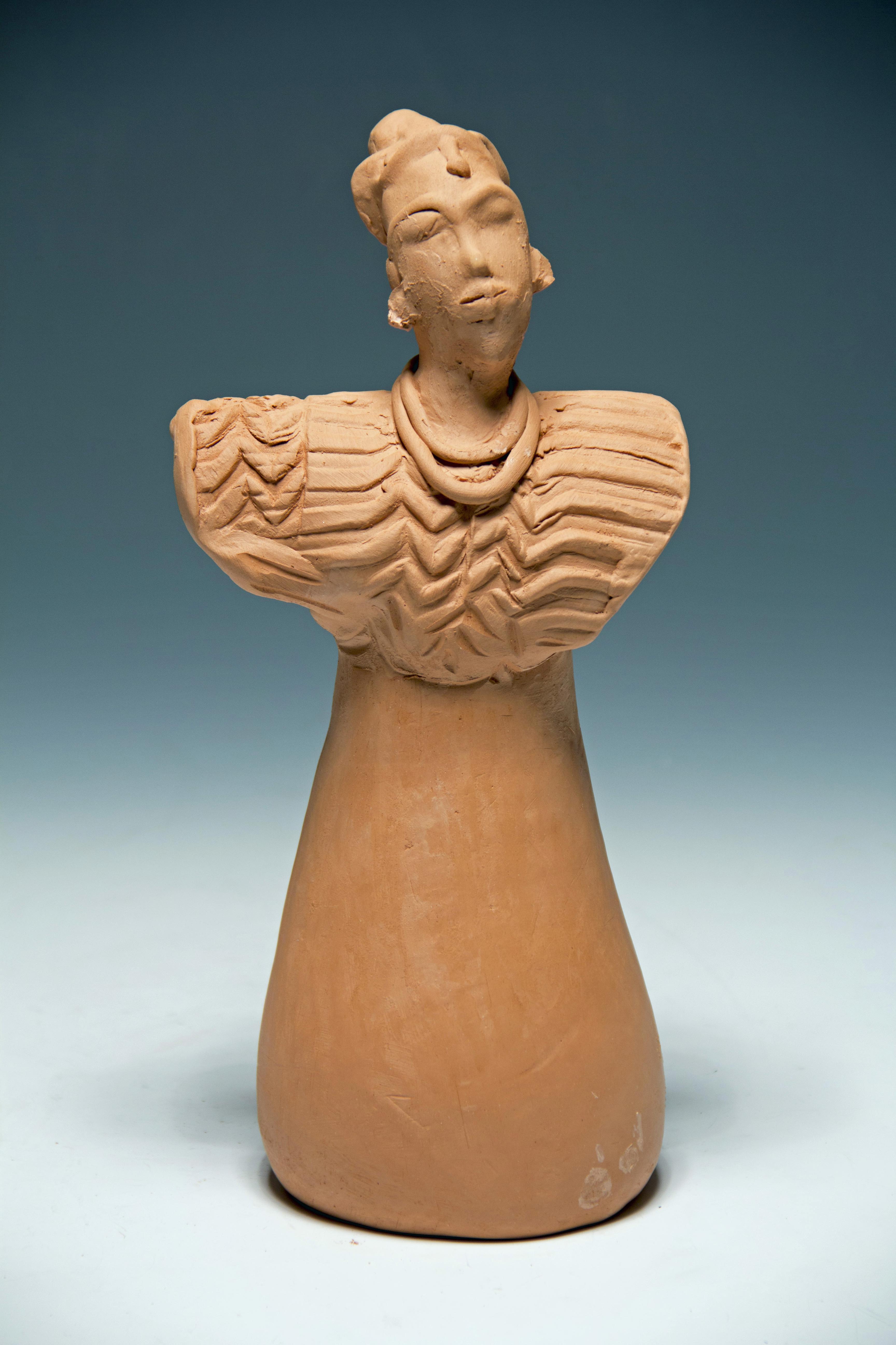 Statue of woman. This artifact is a red clay statue of an African woman. It also resembles many pieces from the Nok society from the material used and same facial structure. 43.2 cm x 16.5 cm