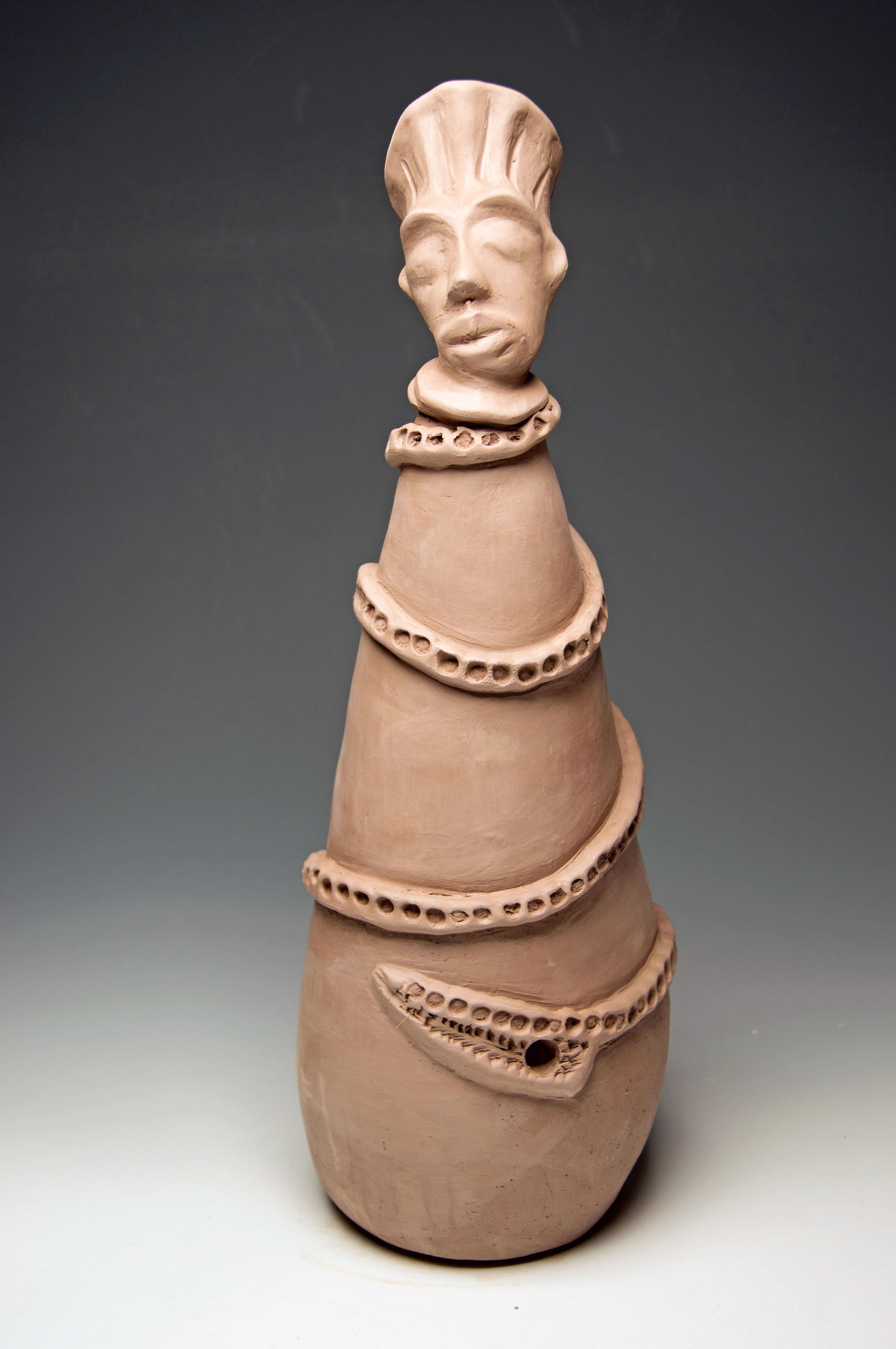 Red clay statue with decorative spiral around base. Also has hat on, possibly religious. 45.7 cm x 15.2 cm