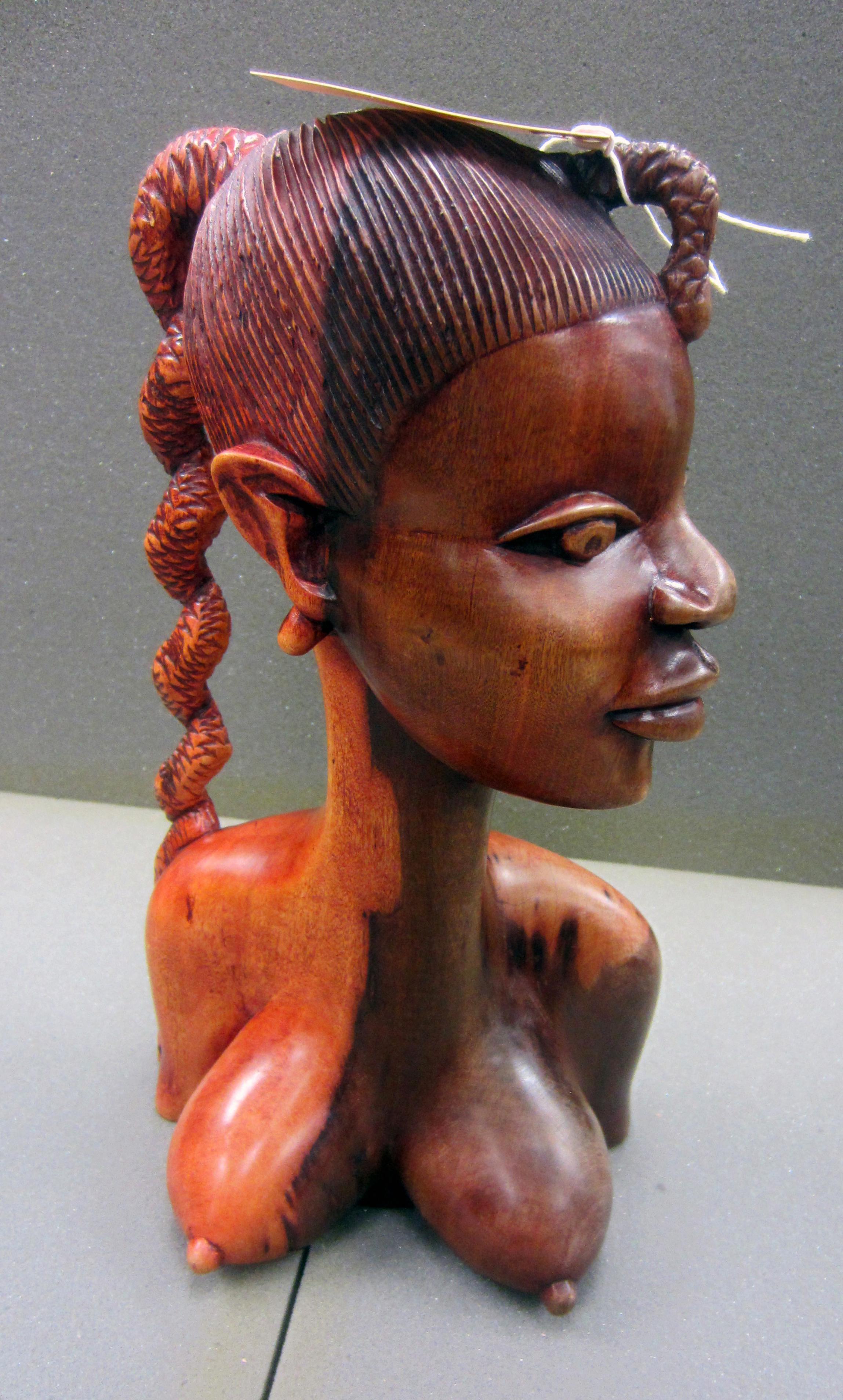 Wooden statue of a naked women, long flowing dreaded hair. Half dark stain, half light. Earrings. 31.75 cm x 16.5 cm