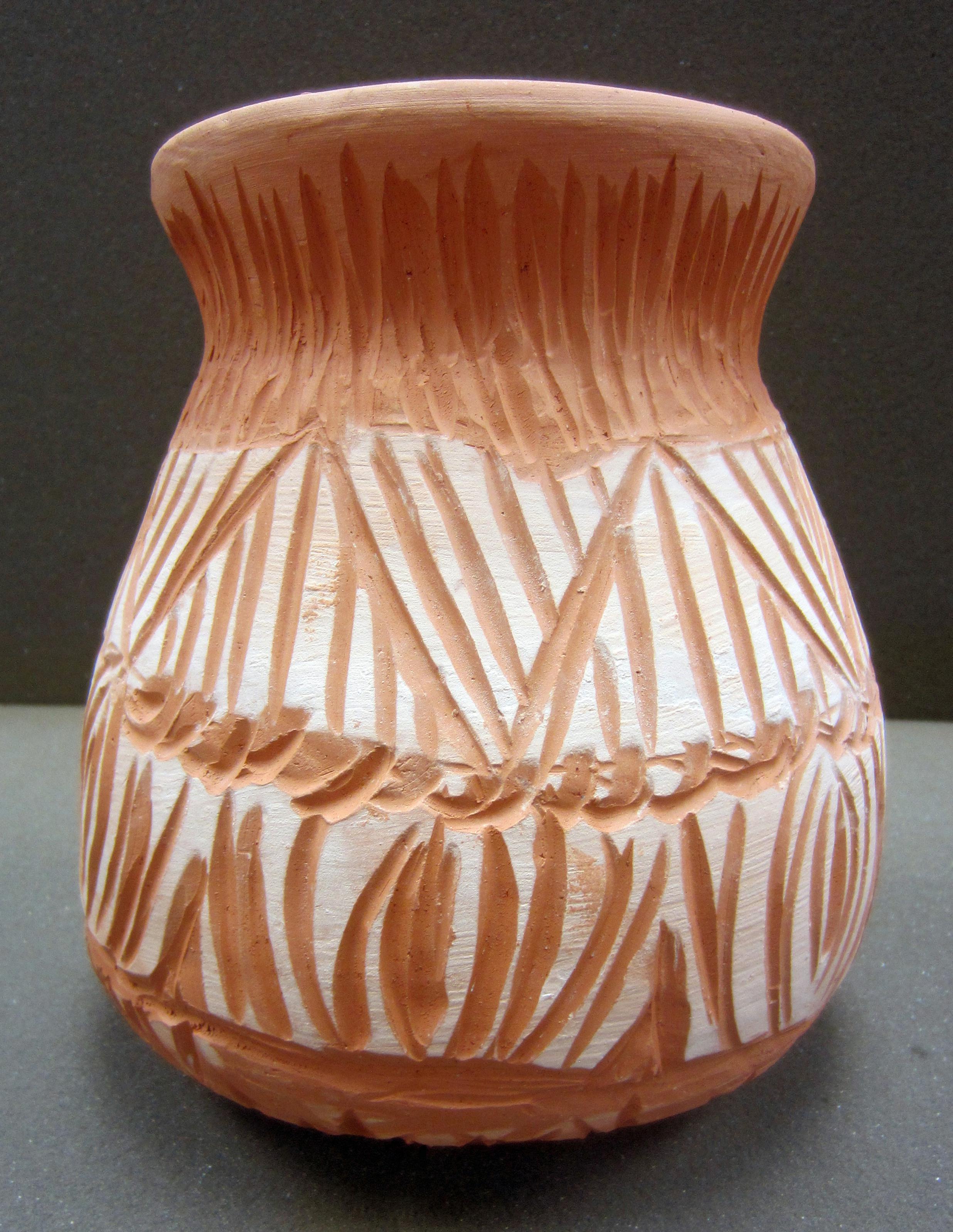 Red clay jug. Water vessel with unique design of white paint in vertical patterns. 19.7 cm x 18.4 cm