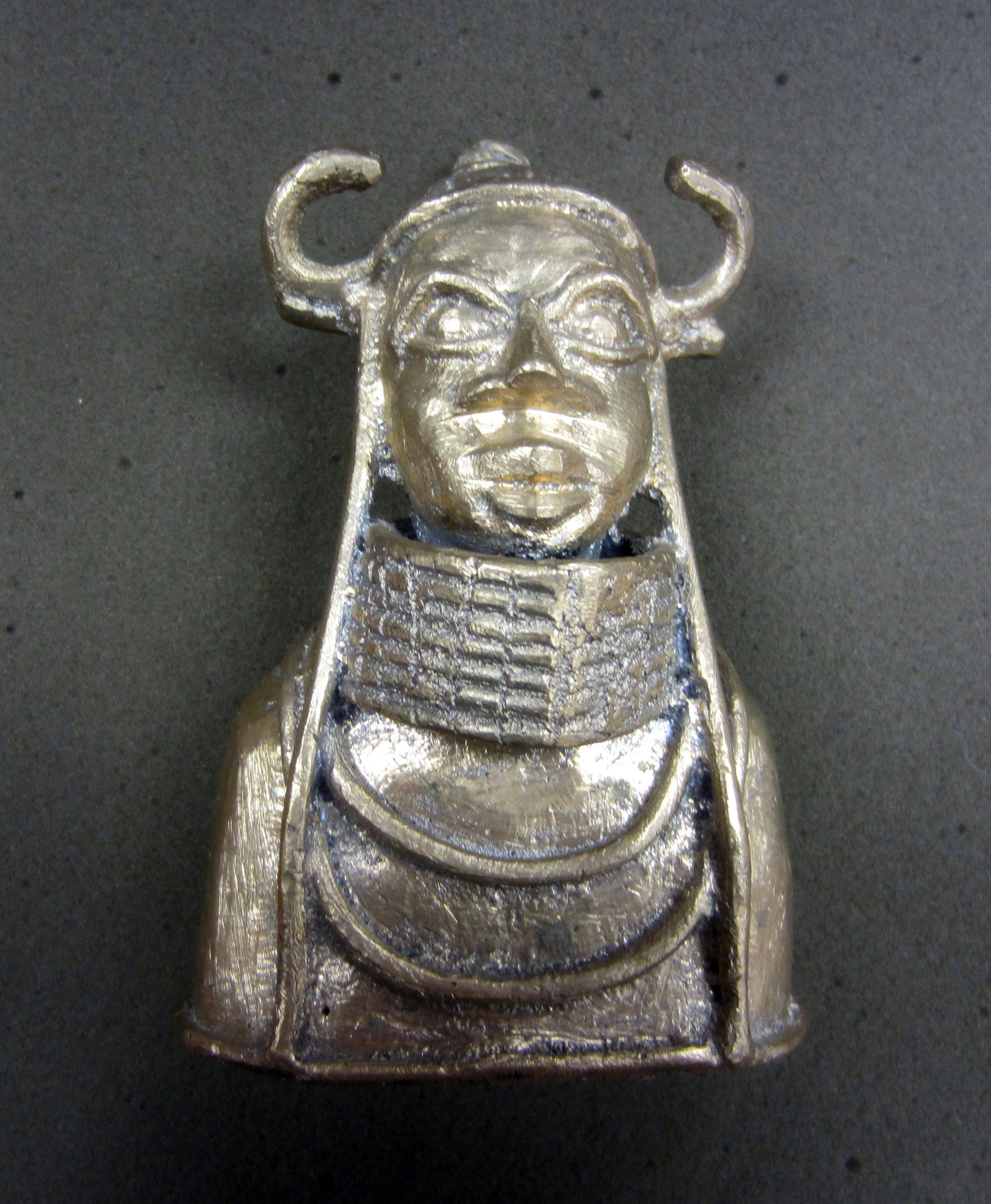 Gold head. Hollow inside. Heavy weight. Wearing some type of hat. 5"X3.5"X2"