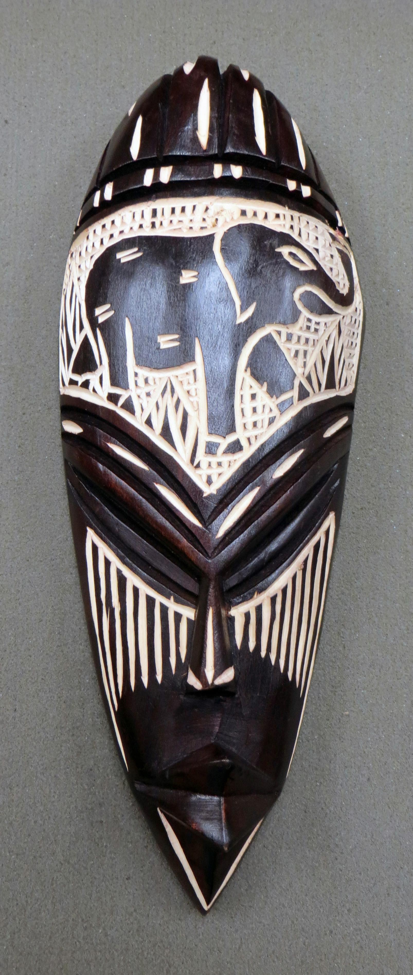 Carved wooden black mask with an elephant carved on top and different accents throughout. 28mm x 10.5mm x 4mm
