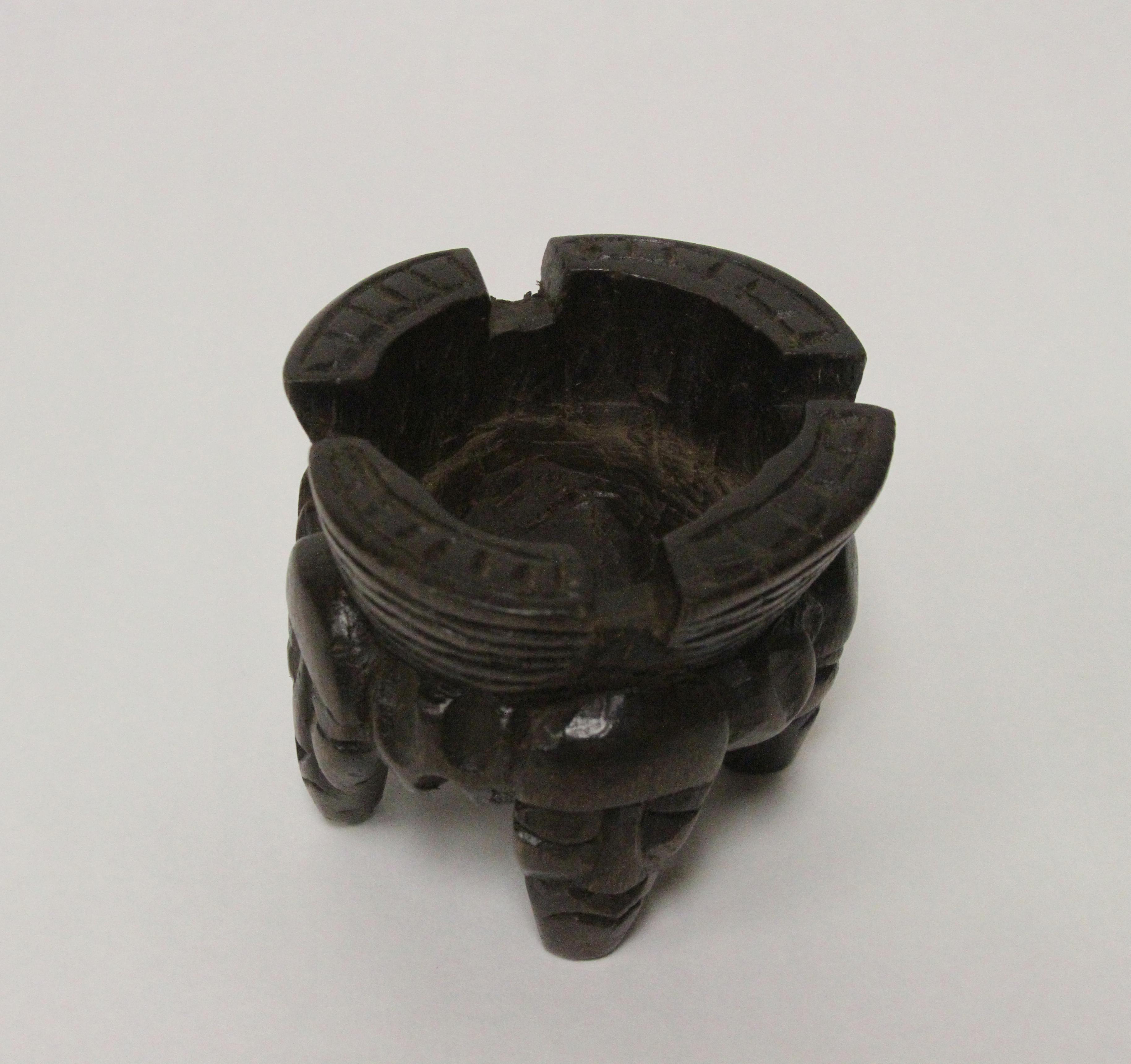 Wooden ashtray with faces and patterns carved in with dark brown finish