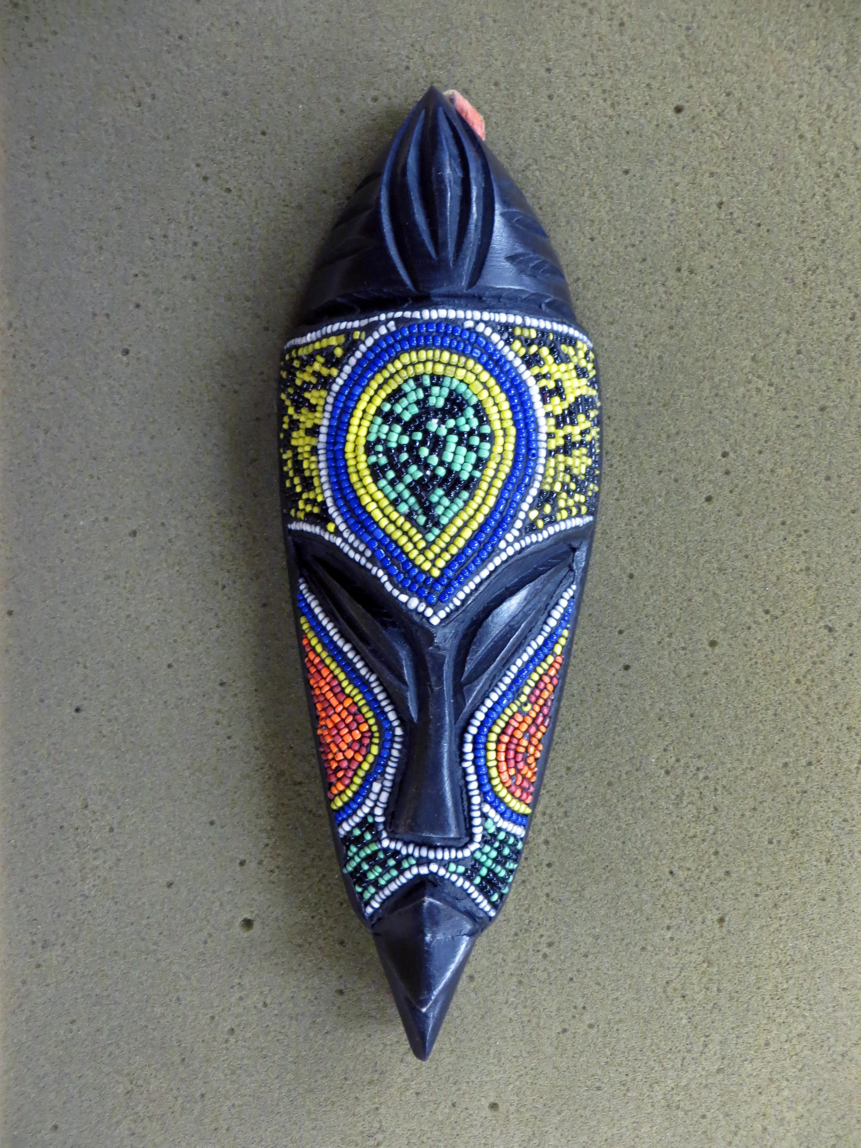 apanga art with a oblong marks. This mask is wooden with carvings in which depicts a face and a crown with beads that go under the eyes and nose and above the mouth with a headband with a oval design. Colors showing are black , green, red, yellow, blue, purple 9inx3in