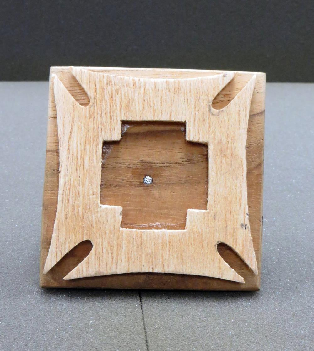 Wooden stamp with a square base and a round top for grasping; Large symbol on the base, which means Fihankra (the circular house or complete house), It signifies safety in the home; 7.62cm X 7cm